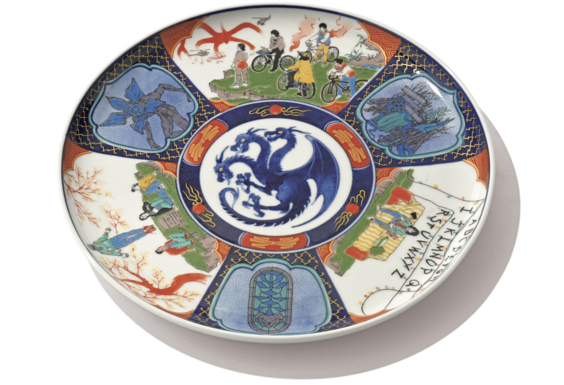 江戸時代に生まれた〝古伊万里金襴手様式〟をオマージュしたデザイン。表と裏側の世界を交互に配置し、伝統的な柄に作品の世界観を落とし込んでいる貴重な作品。200枚限定。古伊万里金襴手人物文 桐箱入1 万6500円/マルヒロ(マルヒロ)