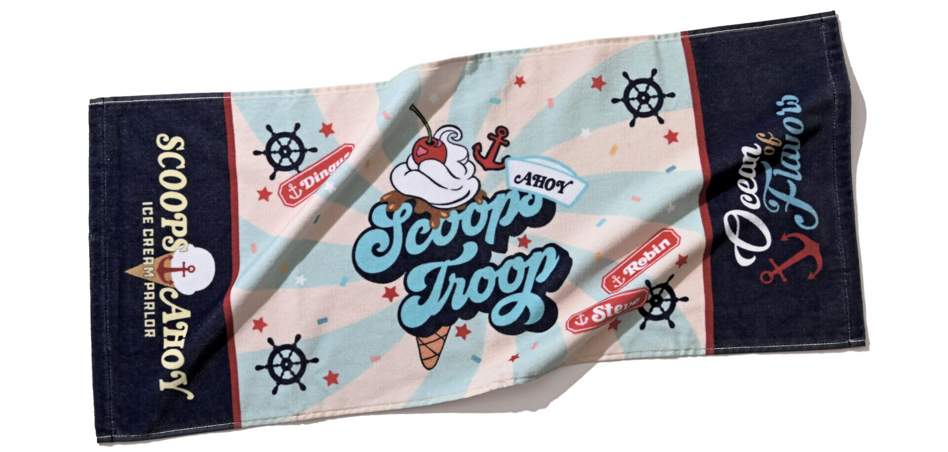 スティーブとロビンのバイト先のアイスクリームパーラー〝スクープス・アホイ〟を大胆にデザインしている。フェイスタオル1980円/ジュン(ジュンカスタマーセンター)