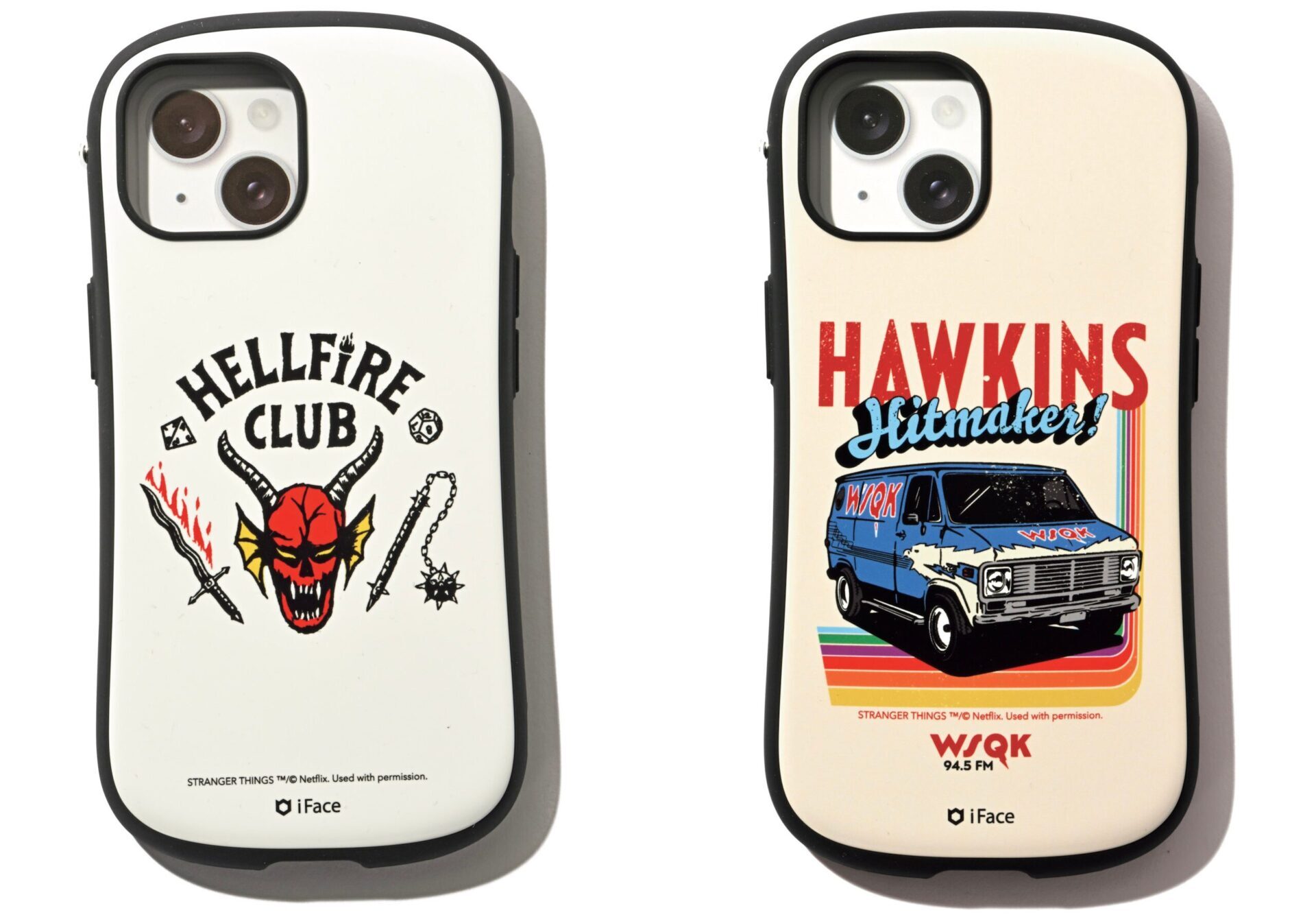 iPhone 15/14/13専用のコラボケース。右:シリーズ最新作に登場するラジオ局「WSQK」をあしらったレトロ風デザイン。アイフェイス ファーストクラス マグシンクケース(WSQK)5720円 左:白黒をベースとしたロックなデザイン。アイフェイス ファーストクラス マグシンクケース(ヘルファイア・クラブ)5720円/アイフェイス(ハミィ)