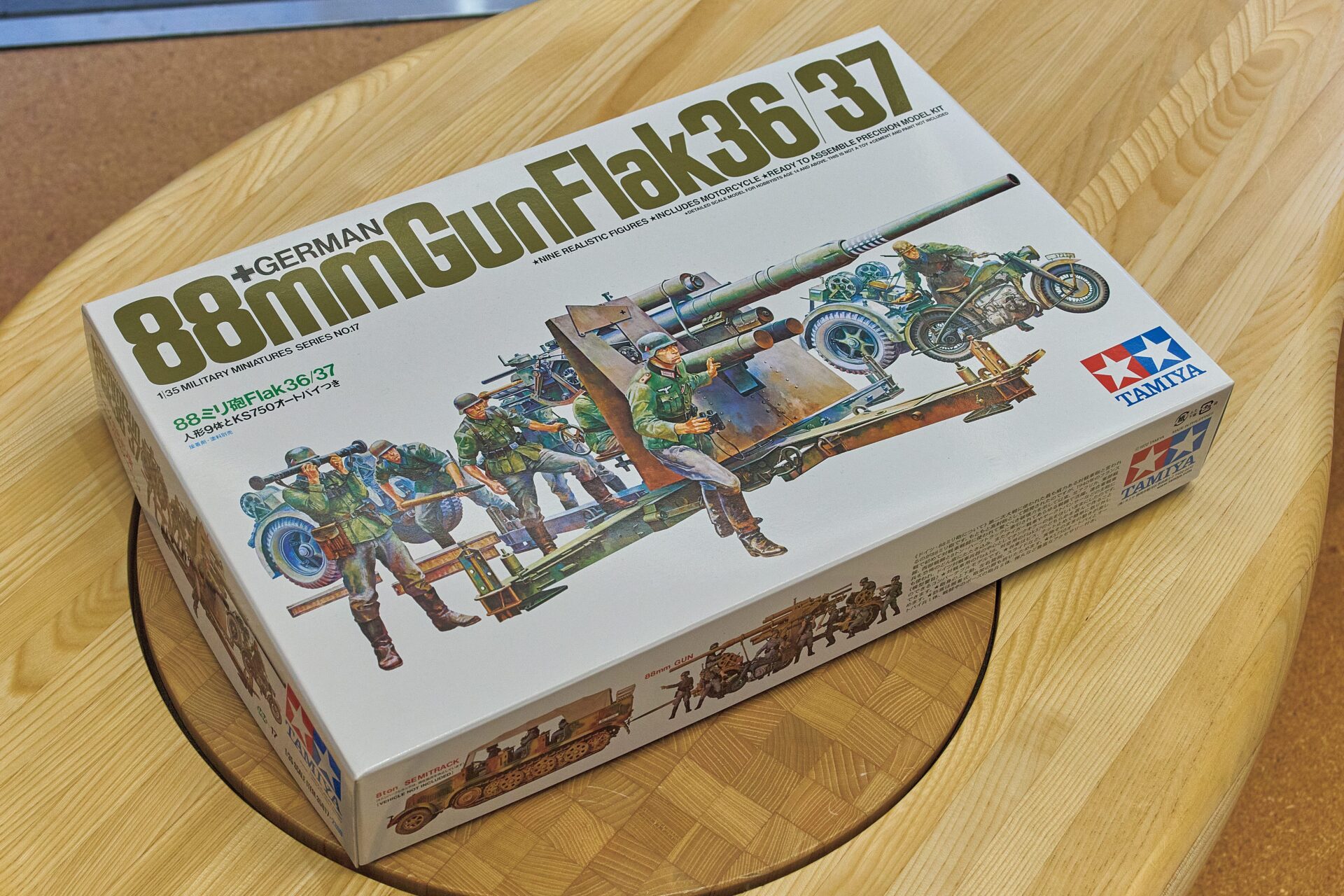 長年愛され続けているタミヤが誇る名作。1972年の10月に発売された1/35ドイツ88 ㎜砲(オートバイ付き)。88㎜砲に関するエピソードなどが記された説明図も人気だ。3080円