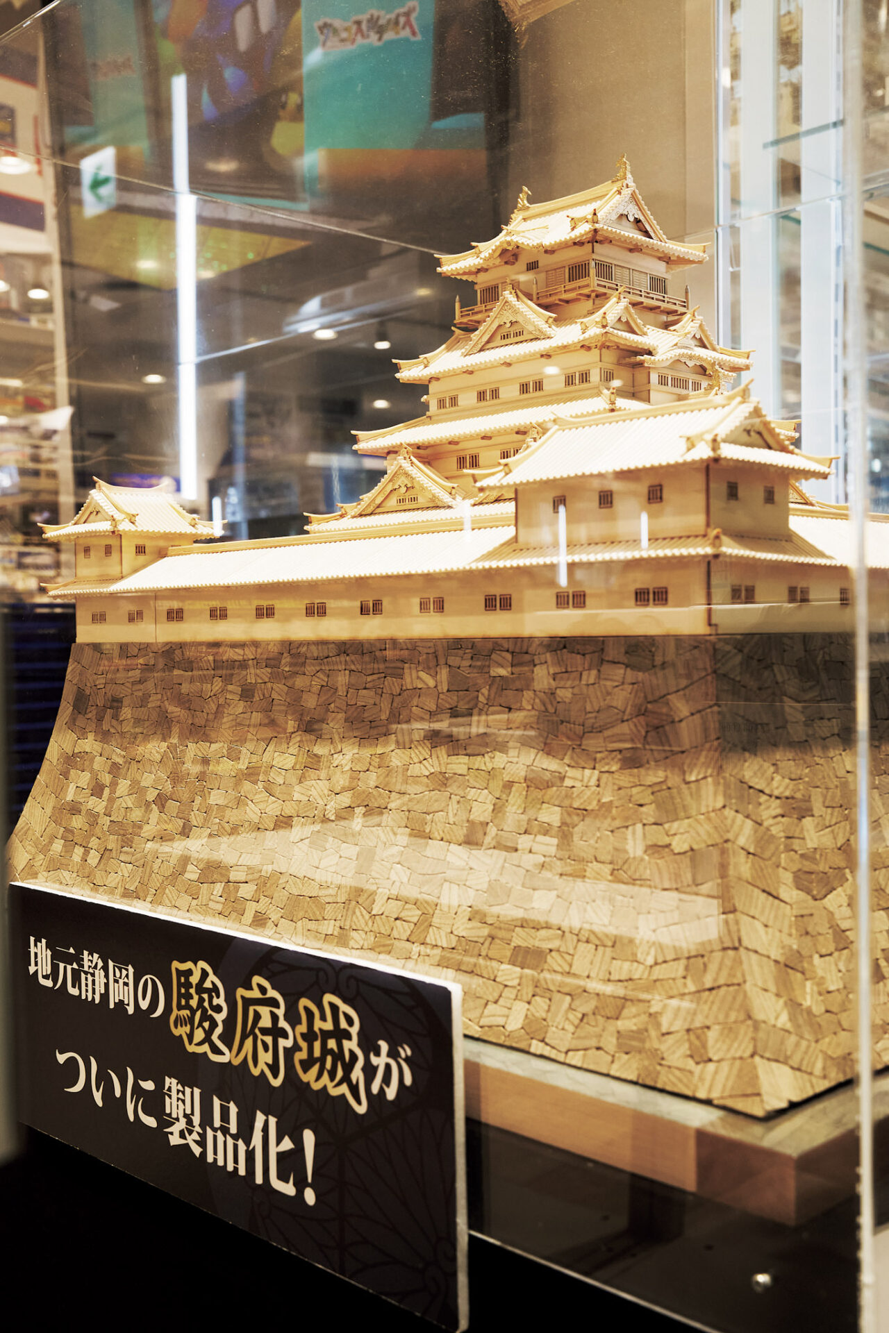 〝ウッディージョー〟を中心とした模型メーカーの城模型も豊富にラインナップ。ショップ近くに位置する駿府城の模型は、完成まで約1年を要する超本格派だ。