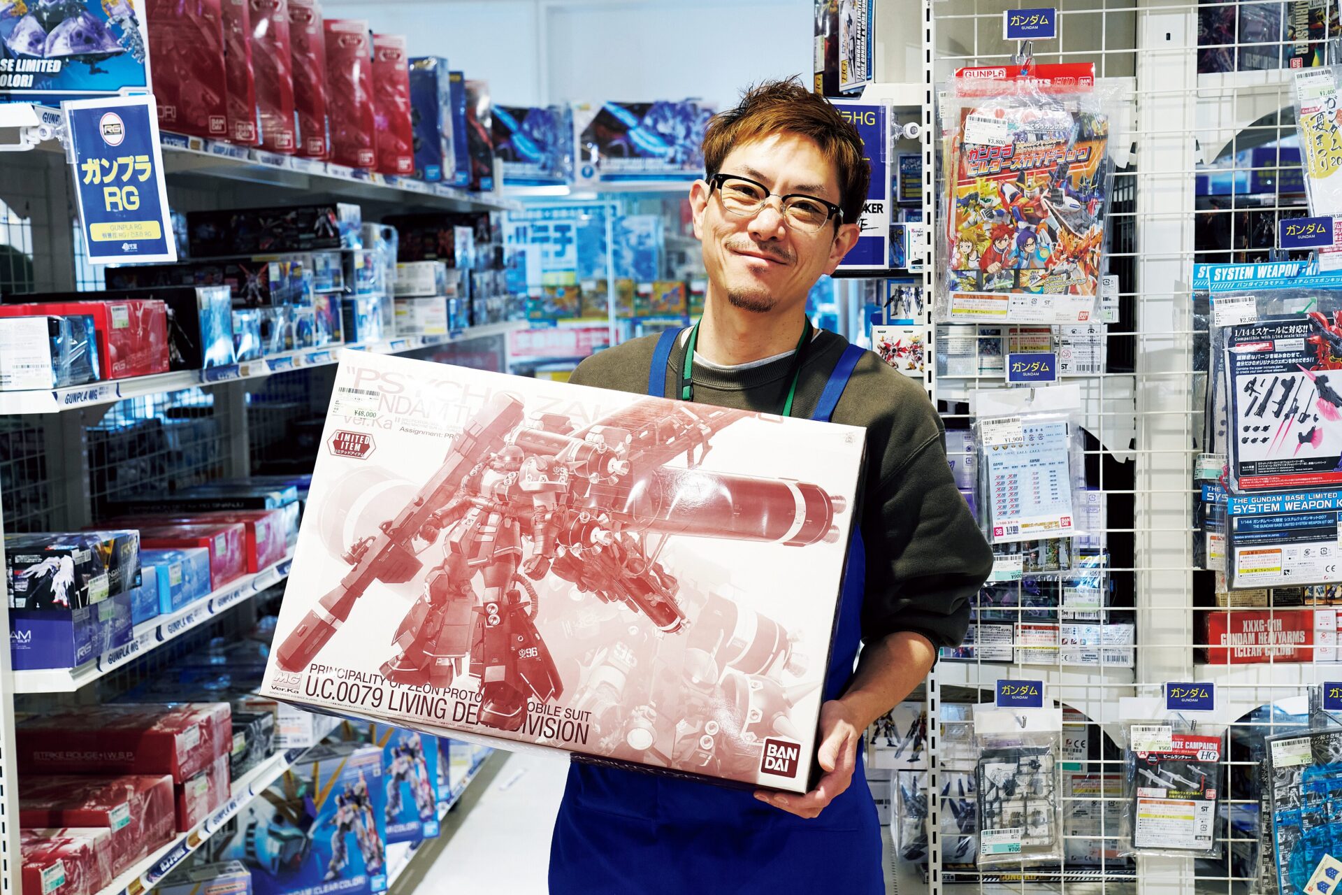 限定カラーや特別仕様などレアモデルがたくさん。スタッフの石井さんが持っているのは、通常であれば赤いデザインのガンプラが一部クリアになっているという珍しい商品。