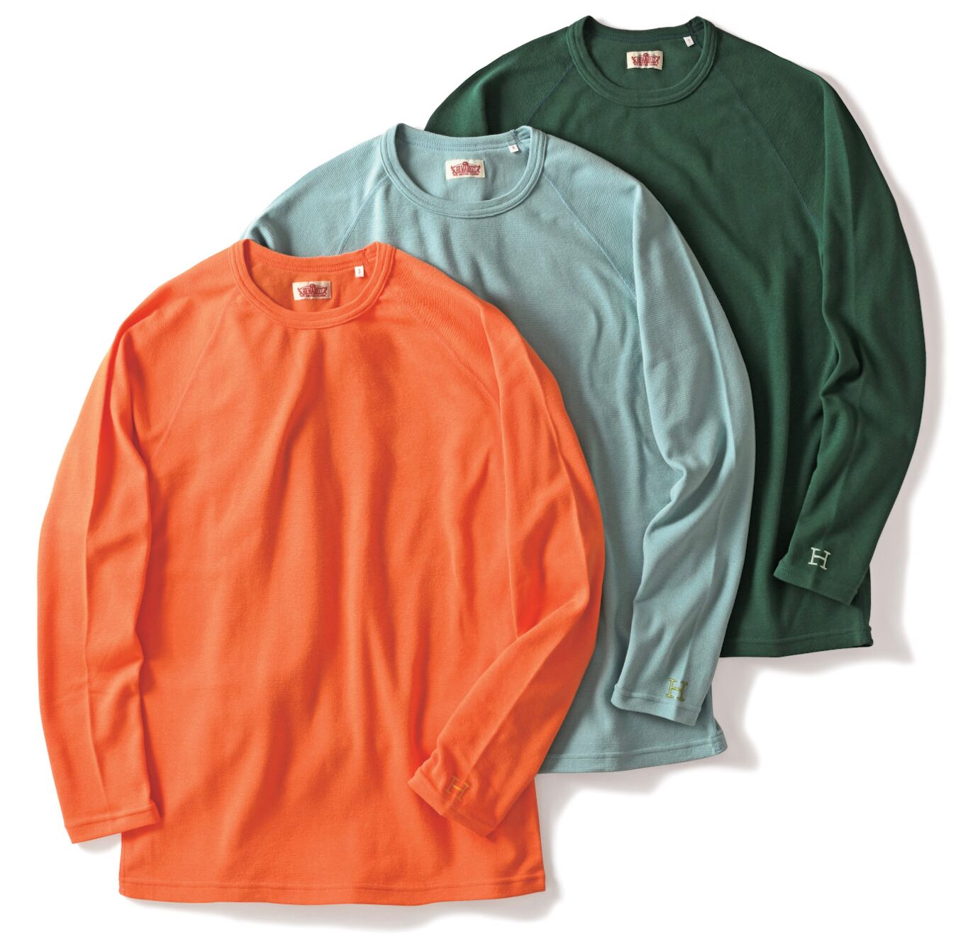 愛されつづけるロングセラー商品である〝ストレッチフライス〟のロングスリーブTシャツ。飽きのこないシンプルなデザインは秋には1枚で、冬にはシャツやスウェットにレイヤードスタイルとして着用するのも◎。さらにカラーバリエーションが豊富で袖口にさりげなくある〝H〟の刺しゅうがアクセントにもなる。