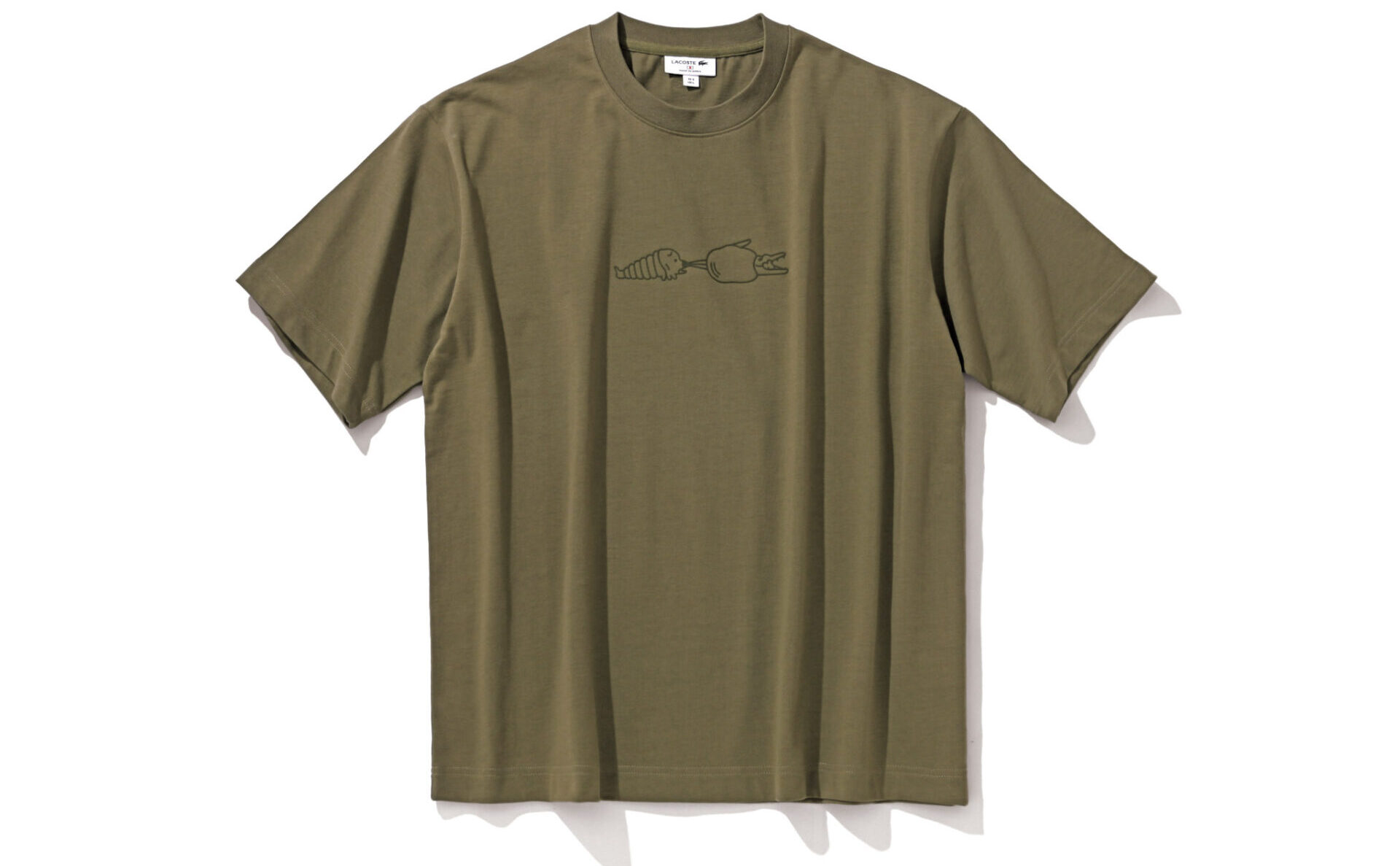 モスラの幼虫がワニを糸でぐるぐる巻きにしている様子をデザイン。オリーブカラーでデイリーに着こなしやすい。Tシャツ1万4300円/ラコステ(ラコステお客様センター)