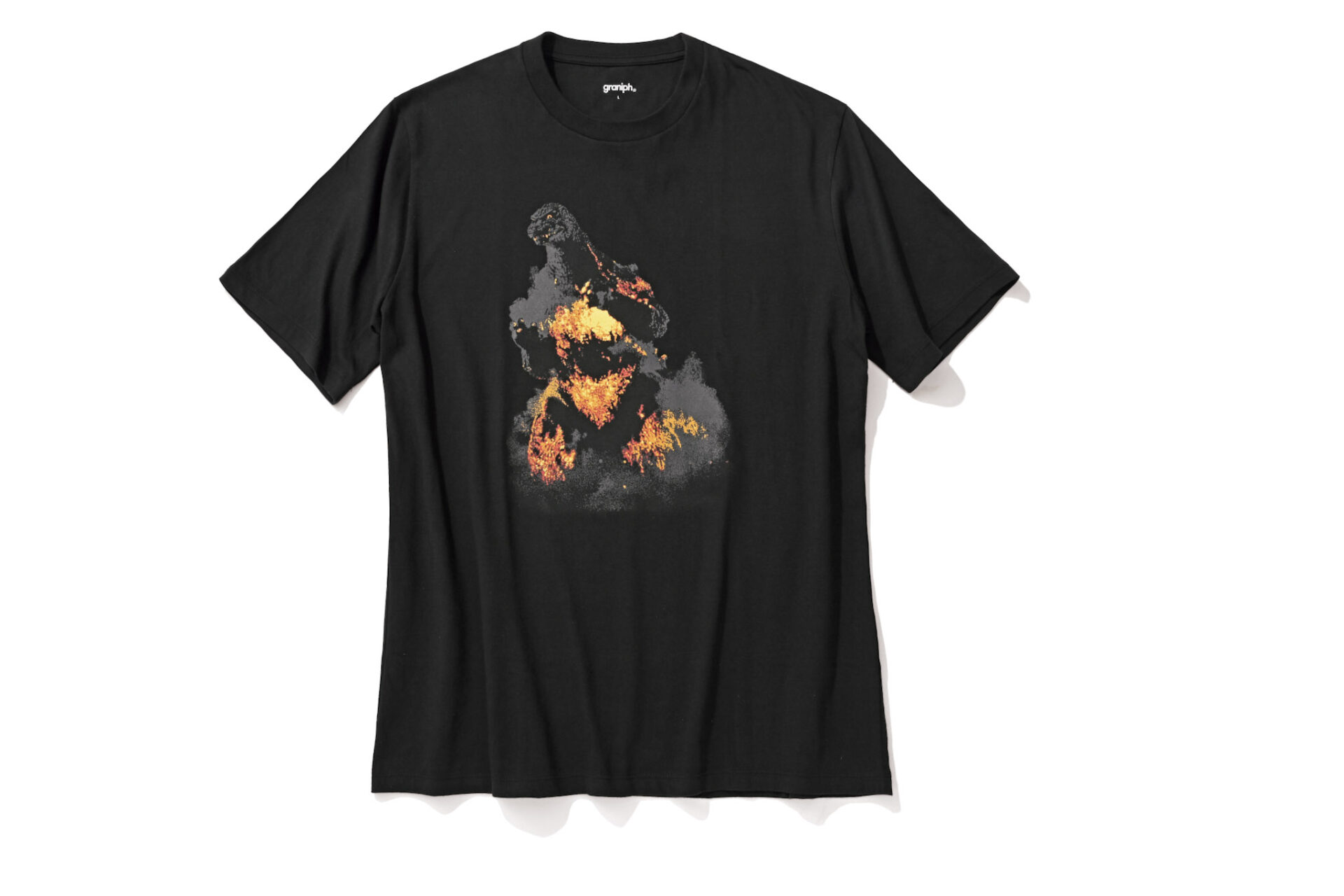 『ゴジラVSデストロア』に出てくる、全身が赤く発光したゴジラがプリントされたバーニングゴジラのTシャツ。赤と黒のコントラストが印象的だ。3500円/グラニフ(グラニフ公式オンラインストア)
