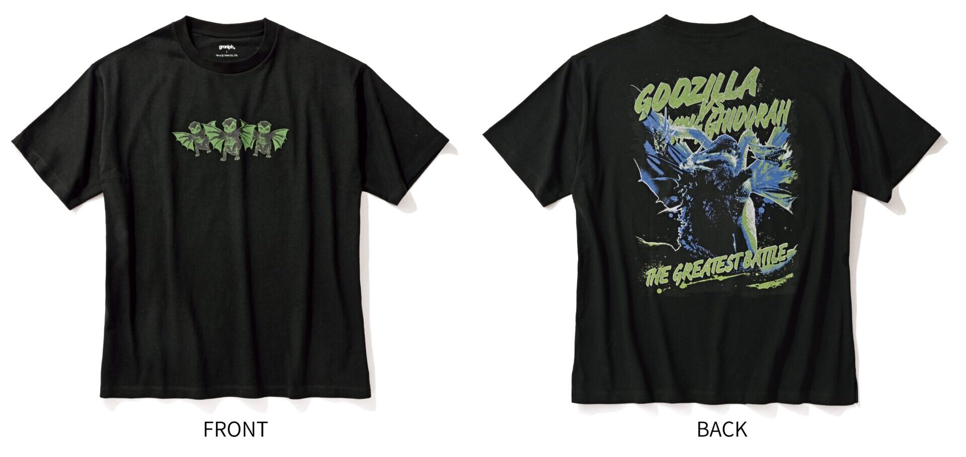フロントには、キングギドラの前身であるドラット。バックには、キングギドラとのバトルシーンが描かれている。ビッグシルエットTシャツ4500円/グラニフ(グラニフ公式オンラインストア)