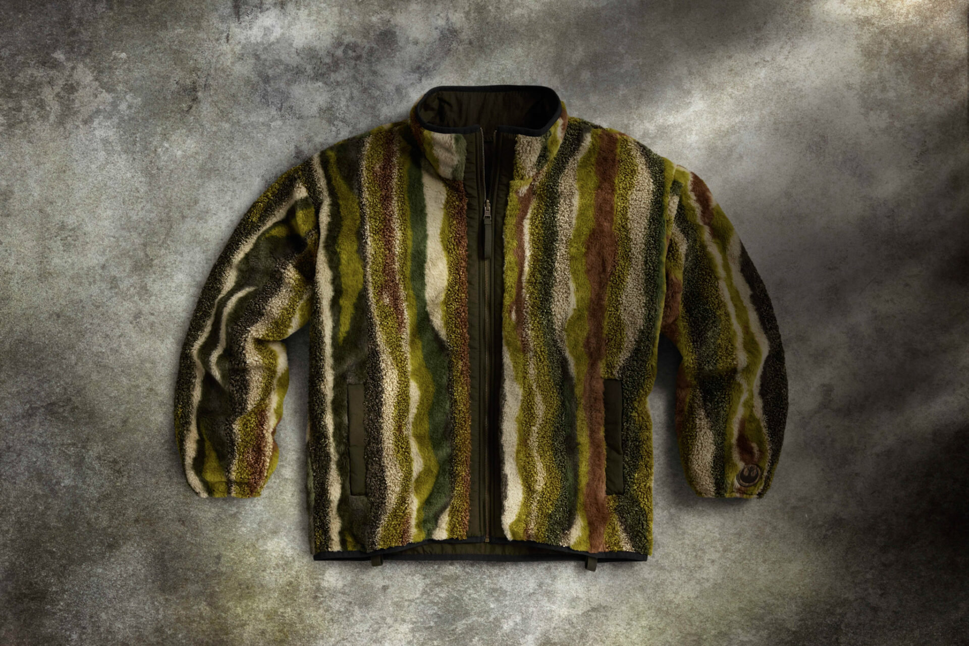 このリバーシブルジャケットは、反乱軍の〝エンドア〟でのミッションにインスパイアされたもので、2ウェイで着用することで、どんなシーンでも快適かつスタイリッシュに着こなせるようなデザインに。反乱軍の紋章、〝エンドア〟に着想を得たフォレスト柄、デイジーチェーンのループなどの本格的なディテールも施されている。両面に反乱軍の紋章、片面には反乱軍にインスパイアされたディテールと、撥水機能(Omni-Shield)を装備。もう片面は〝エンドア〟にインスパイアされたフォレスト柄の柔らかなフリースのリバーシブル仕様となっている。