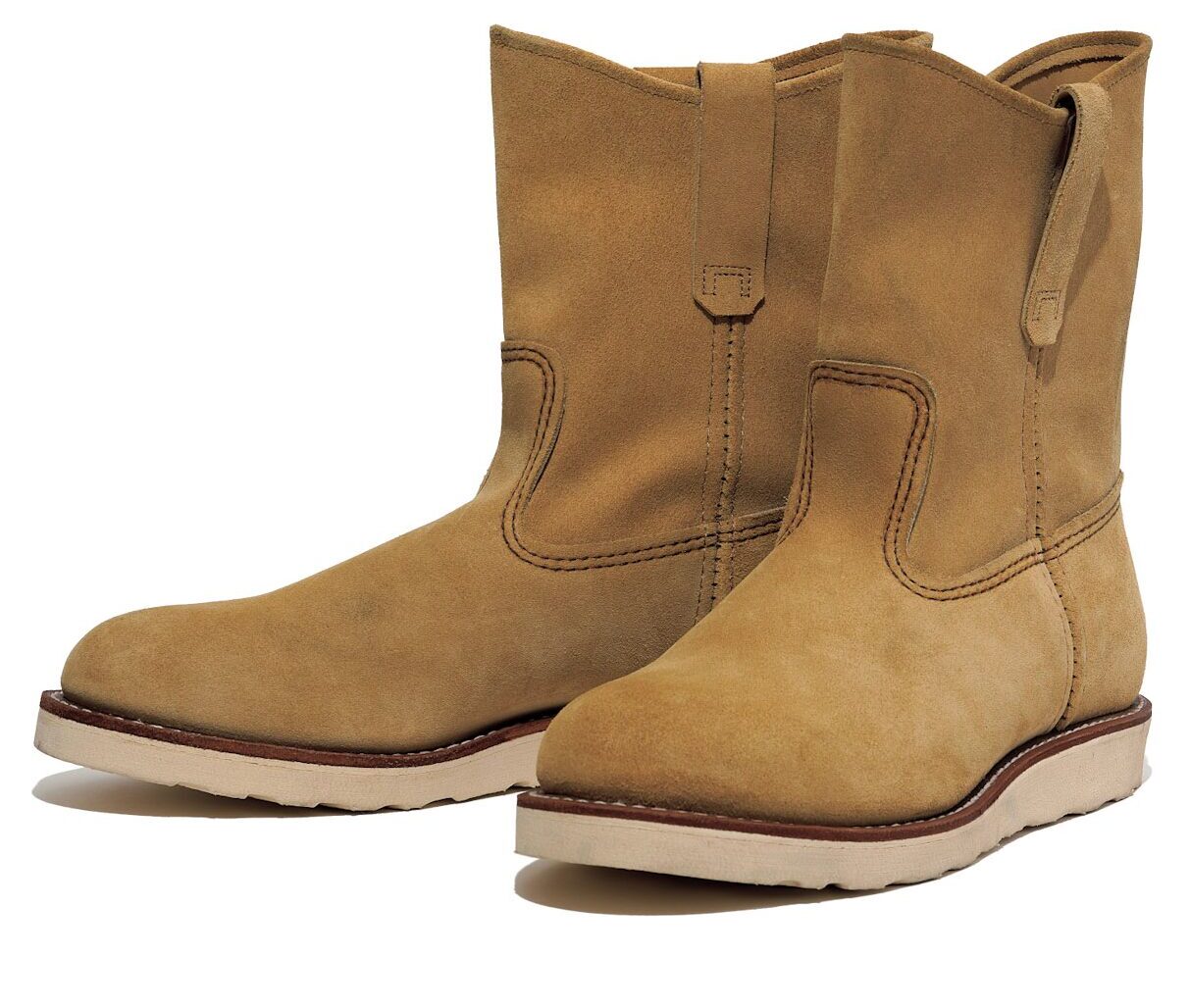 ウエスタン由来のワークブーツとして長年愛され続けてきた9インチペコス。短めの筒や丸みを帯びたつま先など、武骨さと可愛らしさが共存したスタイルが男心をくすぐる。スウェード調のレザーも特徴で、履き込むほどに毛足が寝て色味が濃くなり、シャフトに深いシワが刻まれるなど、経年変化も楽しめる。