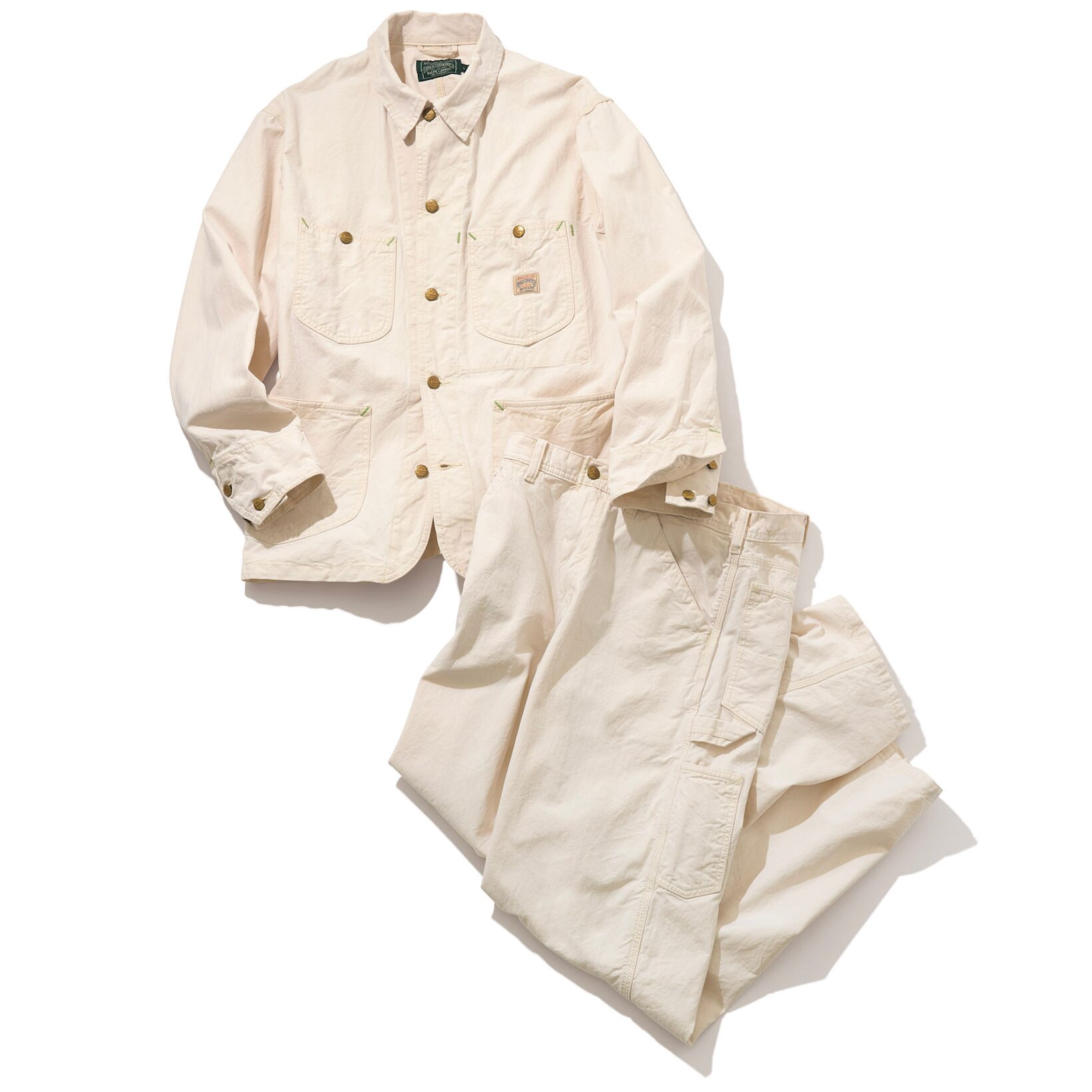 ほんのり柔らかなオフホワイト。ワークテイストなセットアップは、その絶妙な色味だけでこなれて見える。上下で着れば存在感があるが、単品使いでも使い勝手抜群。公園でコーヒーを片手に過ごす午後も、アクティブに動く1日も、軽やかに気分を上げてくれる。