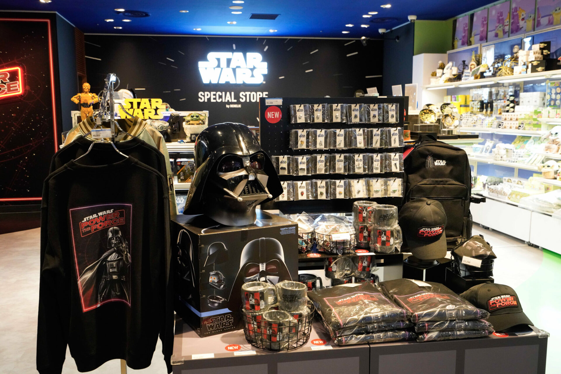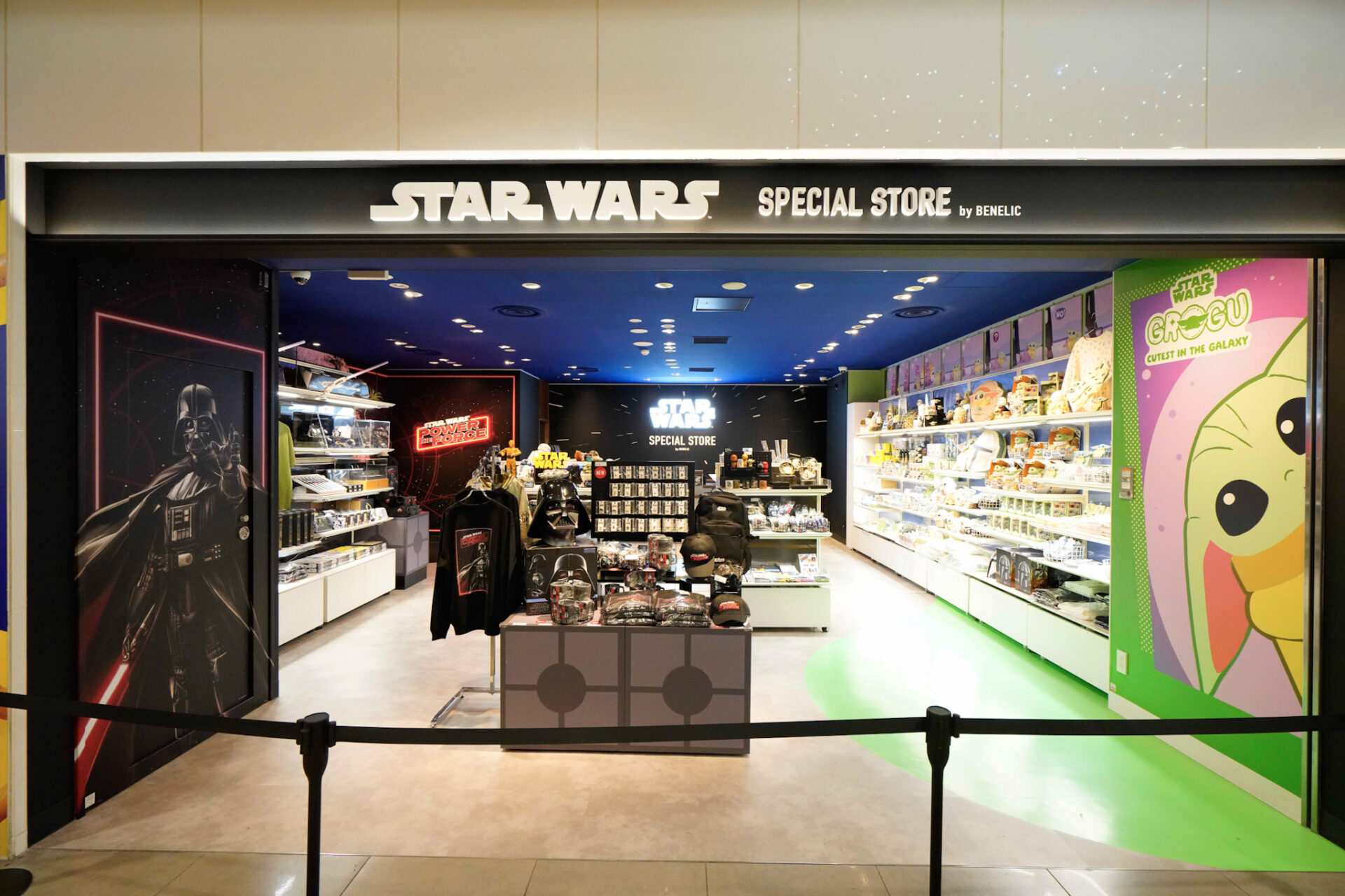 今回、ブルーを基調とした店内のイメージカラーをレッドに一新。ダース・ベイダーや銀河に浮かぶデス・スターなど、ダークサイドをイメージした店舗に変化した。また、愛らしいグローグーの姿が楽しめるSTAR WARS GROGU CUTEST IN THE GALAXYの壁面デザインも新たになり、「STAR WARS SPECIAL STORE by BENELIC」ならではの特別な空間を楽しむことができる。また、映画『マンダロリアン・アンド・グローグー』の公開が来年に控え、注目と人気が増しているグローグーとマンダロリアンのグッズを数多くラインナップ。グッズを手に入れて、公開に備えよう!