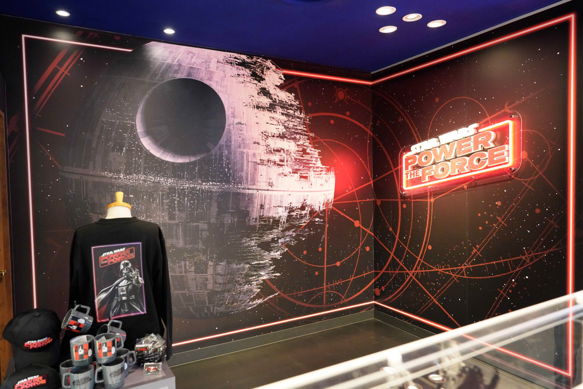 店内に設置されたフォトスポットもリニューアル。今回はEP4で登場したデス・スターが背景となっている。POWER THE FORCEのロゴ前に立って撮影すると浮いているように撮影できるという噂も。ぜひトライしてみよう!