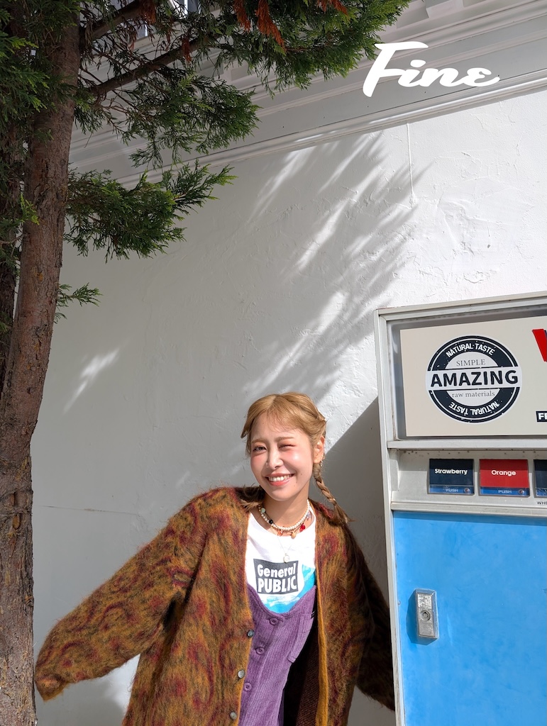 撮影日はちょっぴり曇り空だったんだけど、そのグレーな空気が、むしろ〝ストシン感〟をブースト。「’80sムード漂うキュートな着こなしを全力で楽しんだよ」。ちょっと子生意気な表情も今回のこだわりポイントなんだって!