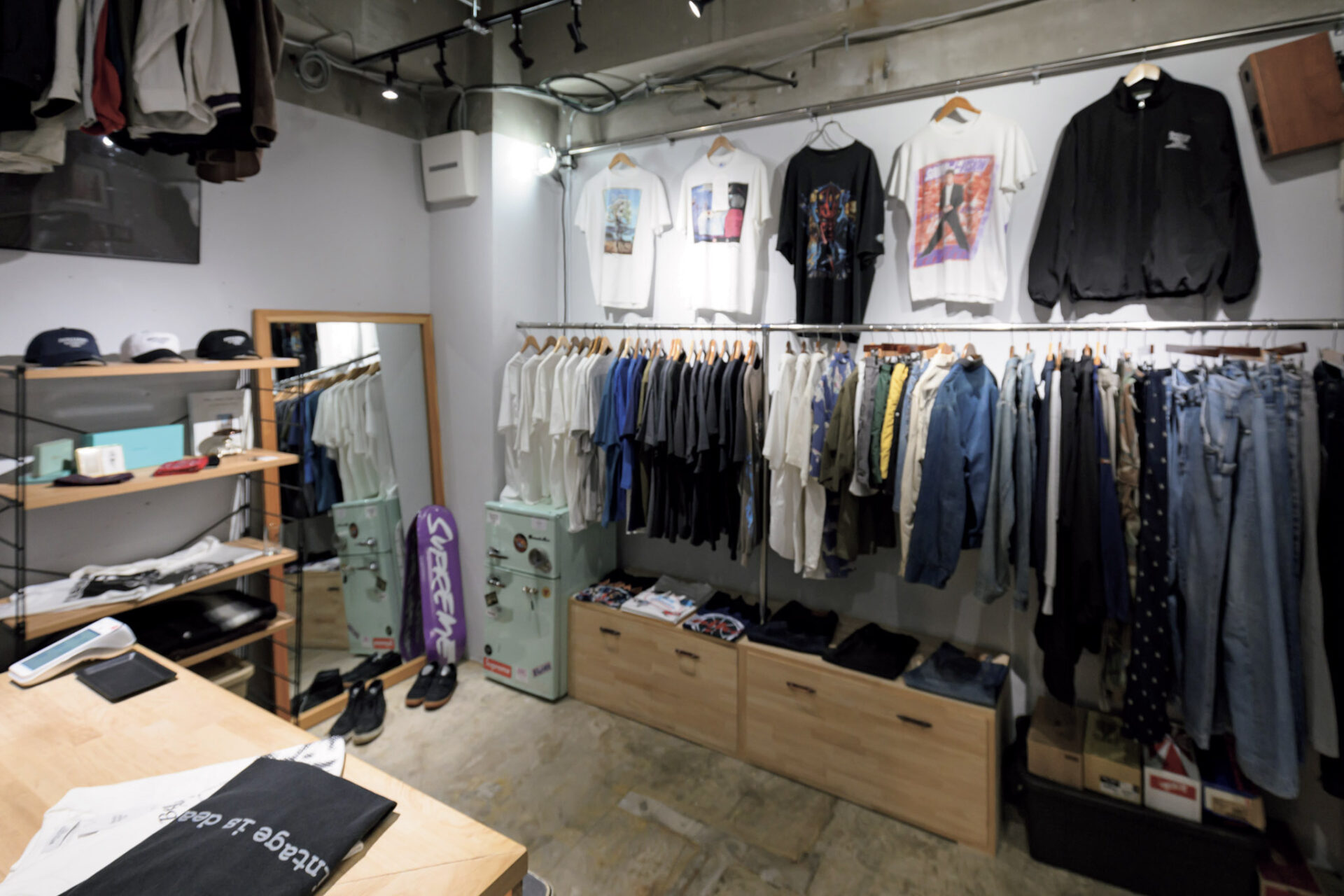 元々はアパレルデザイナーのオーナーが自身の収集品を置く倉庫代わりに始めた空間。原宿ストリートや90年代カルチャーを映した古着と、アメリカのテキサスで買い付けたストリート系が並ぶ。古着と新品が同じ温度で共存し、週に10~15着が新しく入荷する。