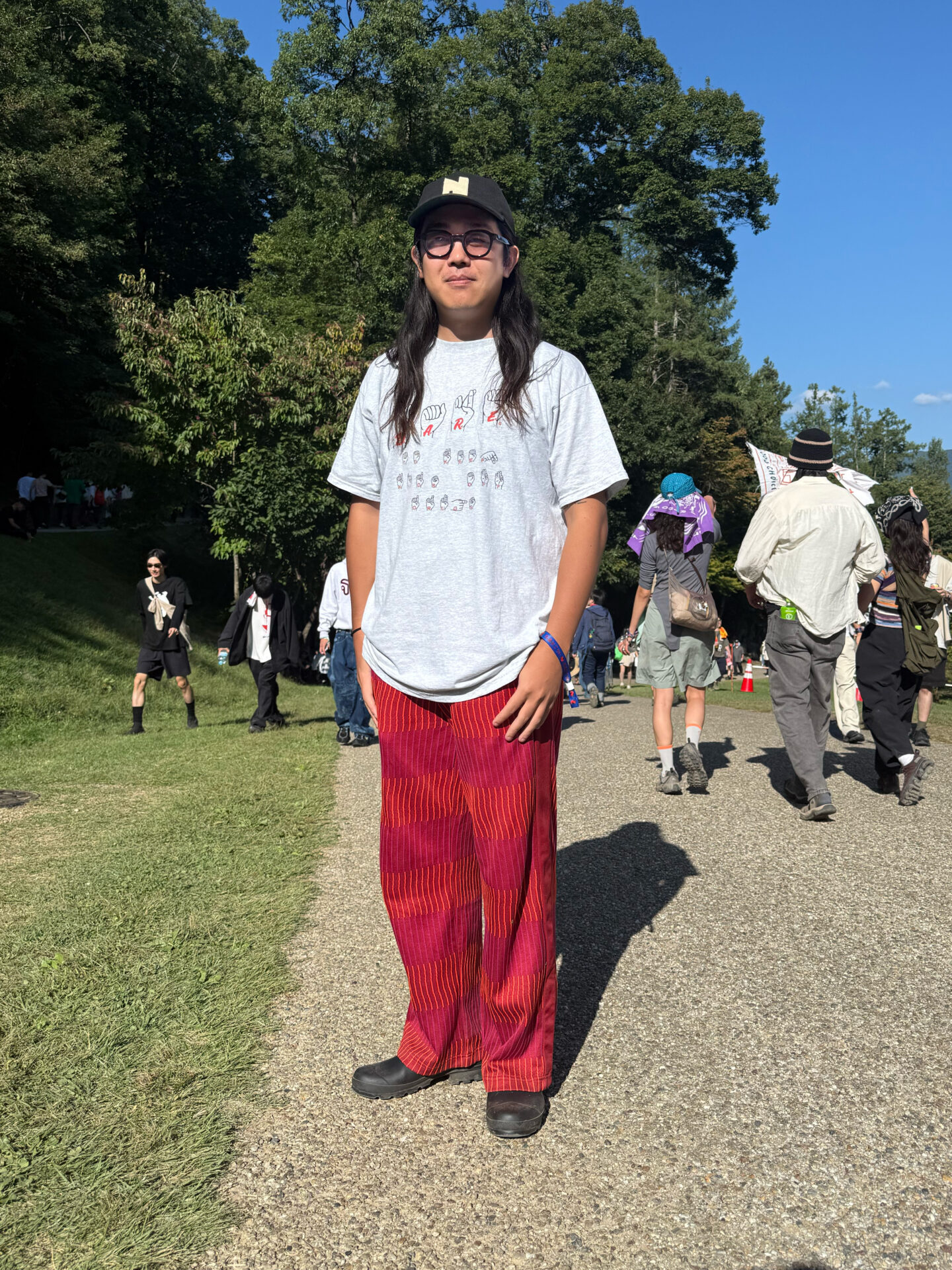 古着のTシャツにプーマの赤系ストライプパンツ。キャップとメガネで落ち着きを出し、足元は軽快にまとめた王道フェススタイル。
