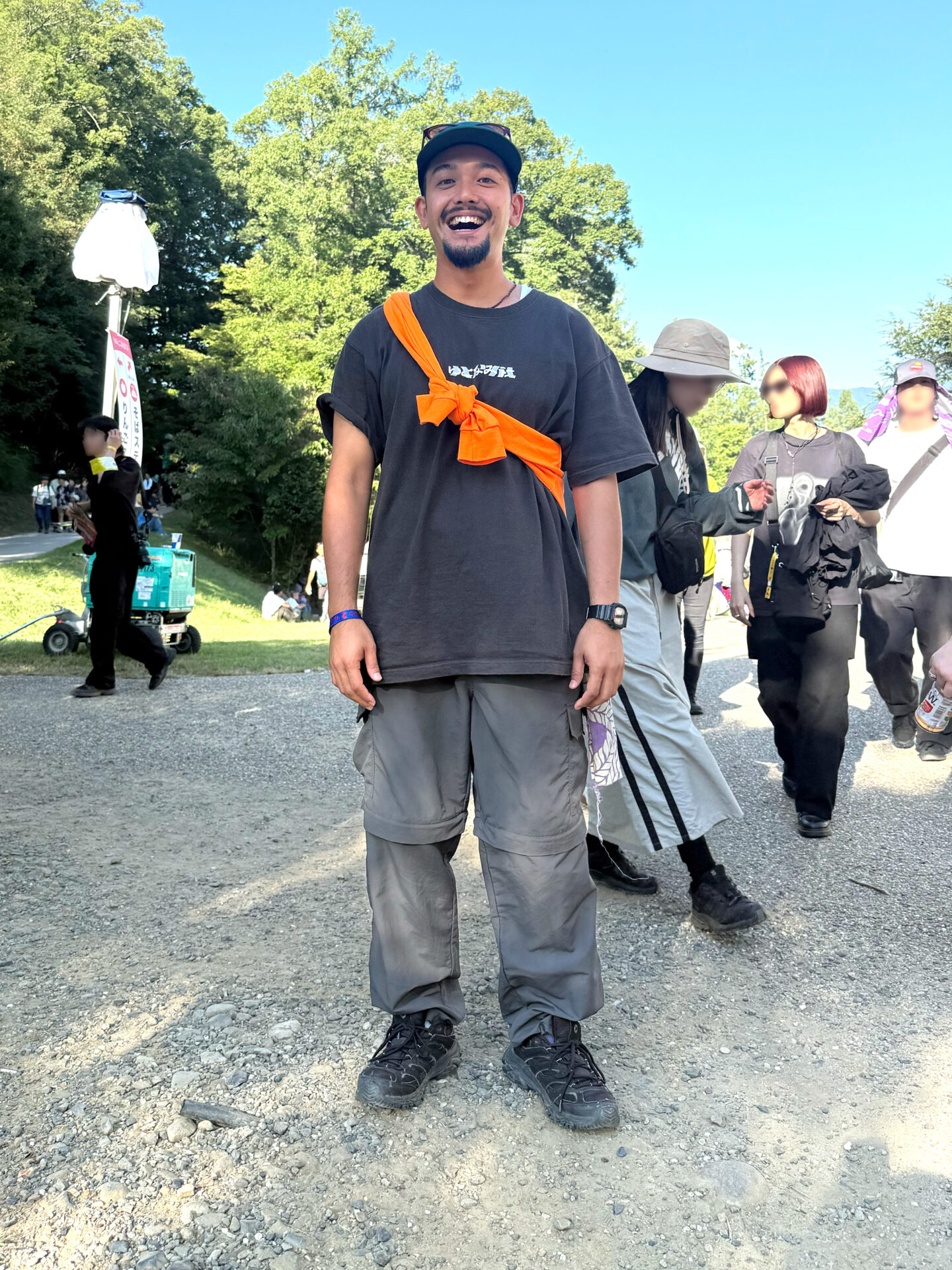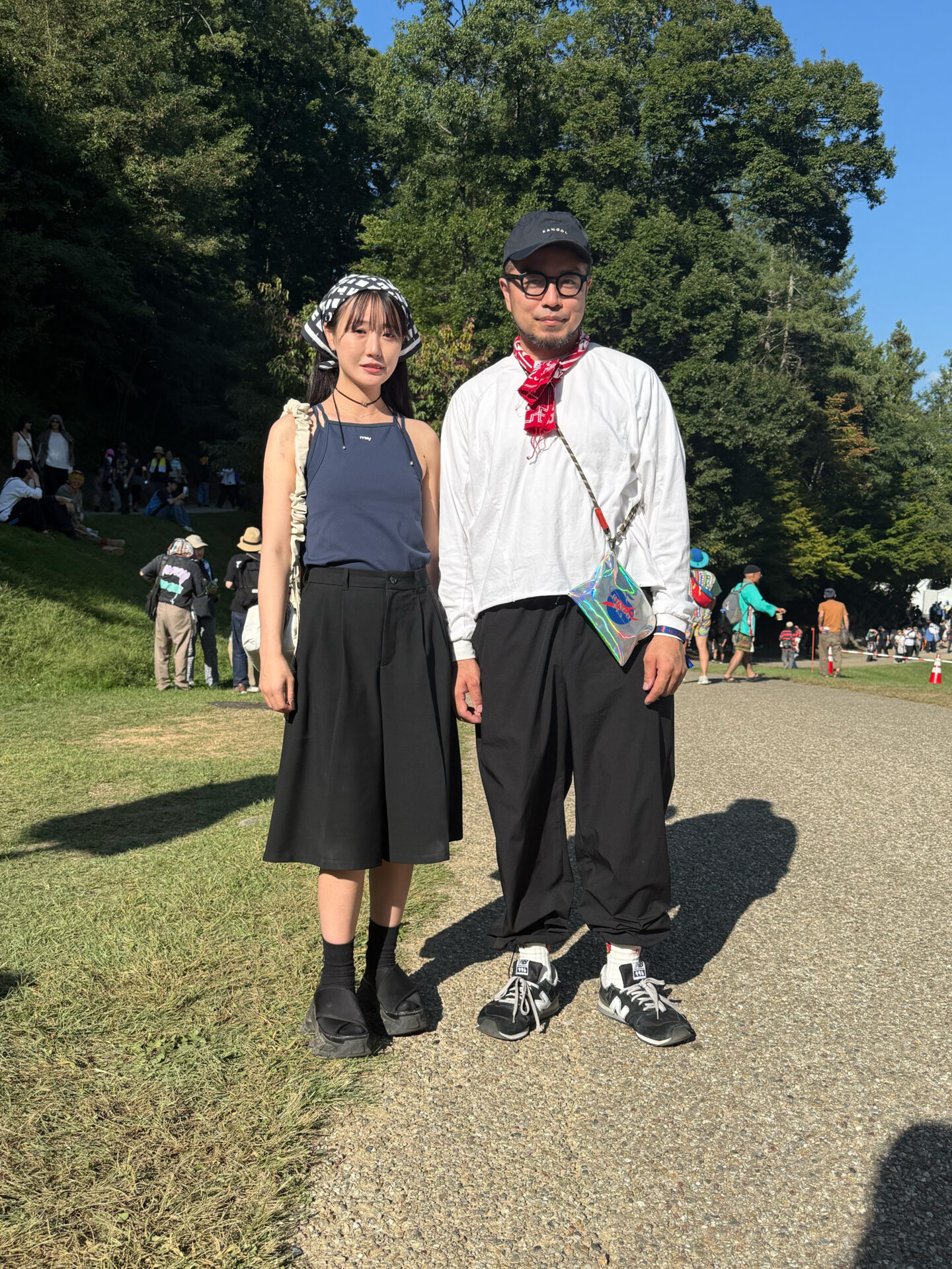 よししさんはネイビーのタンクに黒のキュロット風パンツ、モノトーンのバンダナ。トムオさんは白シャツ×黒パンツのモノトーンに赤いバンダナを差し、足元はニューバランスで機動力を確保。