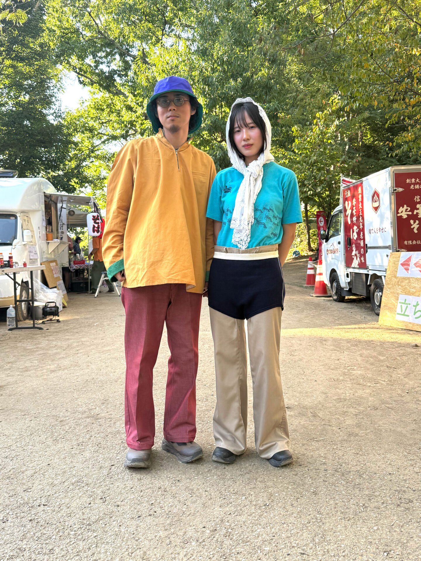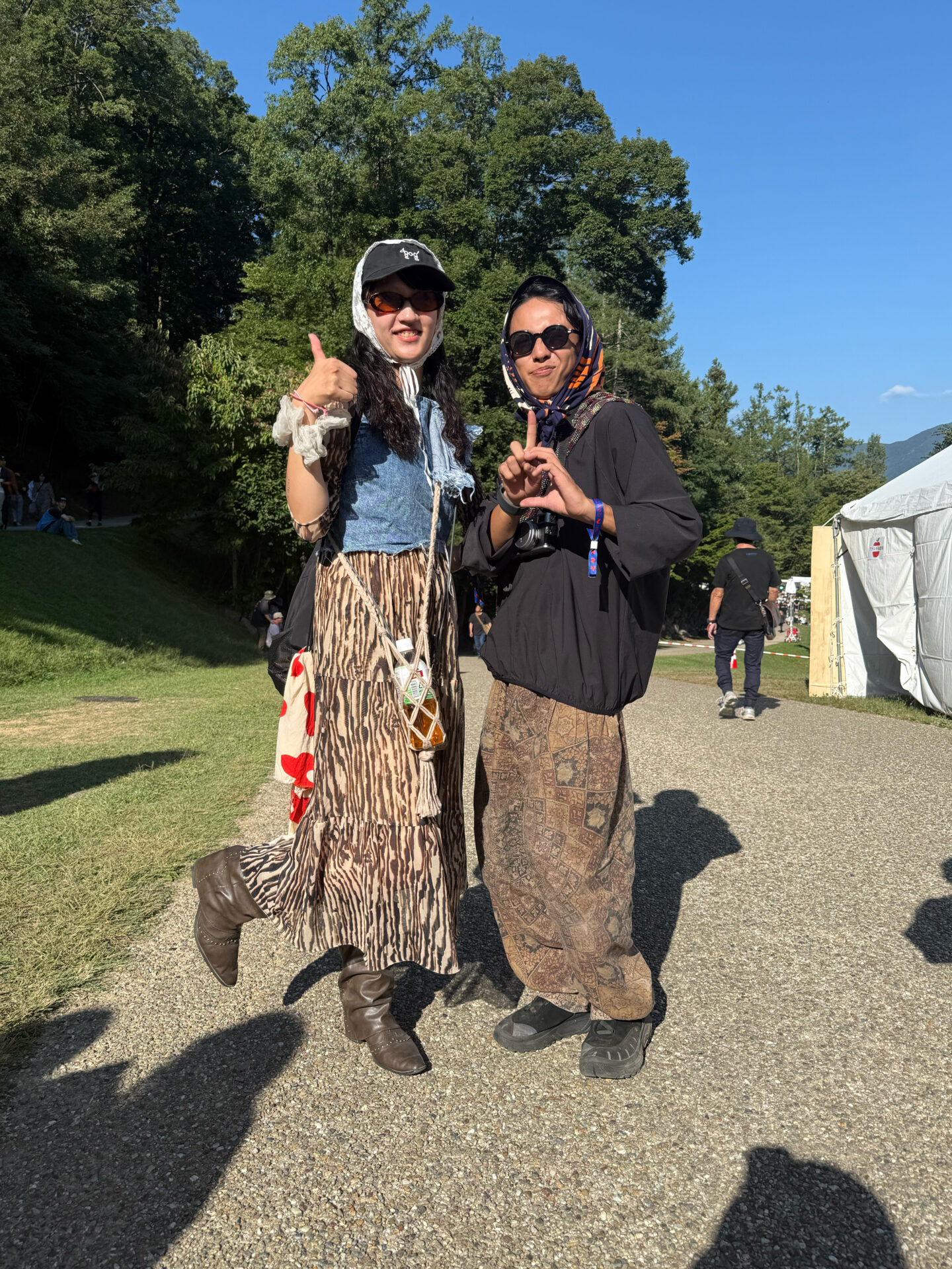 ミオリさんはキャップとサングラスに白のスカーフ、デニムベストとアニマル柄ロングスカートで存在感。リョウさんは黒トップスにエスニック調ワイドパンツ、丸サングラスで余裕のあるムード。