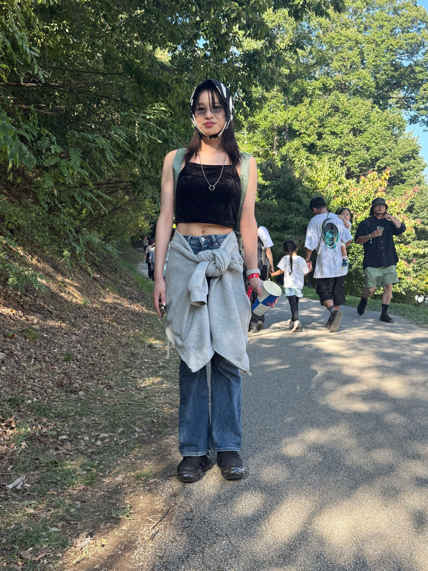 黒のベロアキャミにデニム。腰にグレーのスウェットを巻いて実用性を足し、アウトドアシューズとスカーフ、サングラスでフェスらしいギア感をプラス。