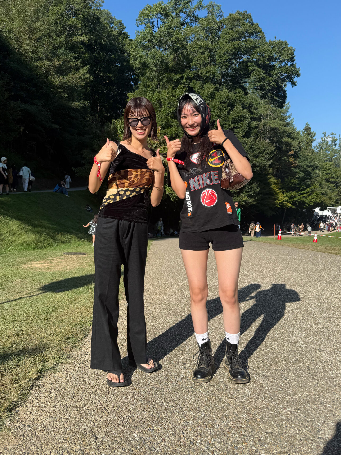 Mさんはアニマル柄のチューブトップに黒ワイドパンツ、存在感のあるサングラスで引き締め。ちょんさんはナイキのTシャツと黒ショーツ、足元はドクターマーチン。ソックスのロゴと首元のバンダナがアクセント。