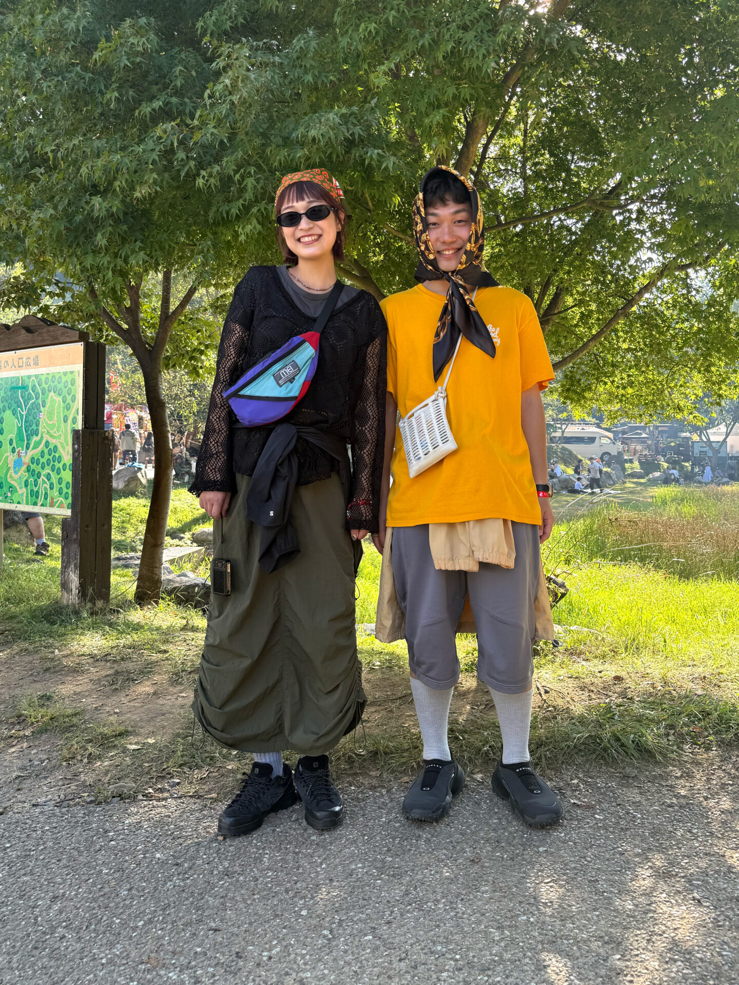黒のレーストップにカーキのロングスカート。サングラスとバンダナで軽やかさを加え、差し色のウエストバッグが効く。隣はオレンジのTシャツを主役に、ショートパンツ+レギンスで実用性を確保。首元のスカーフが個性を添えていた。