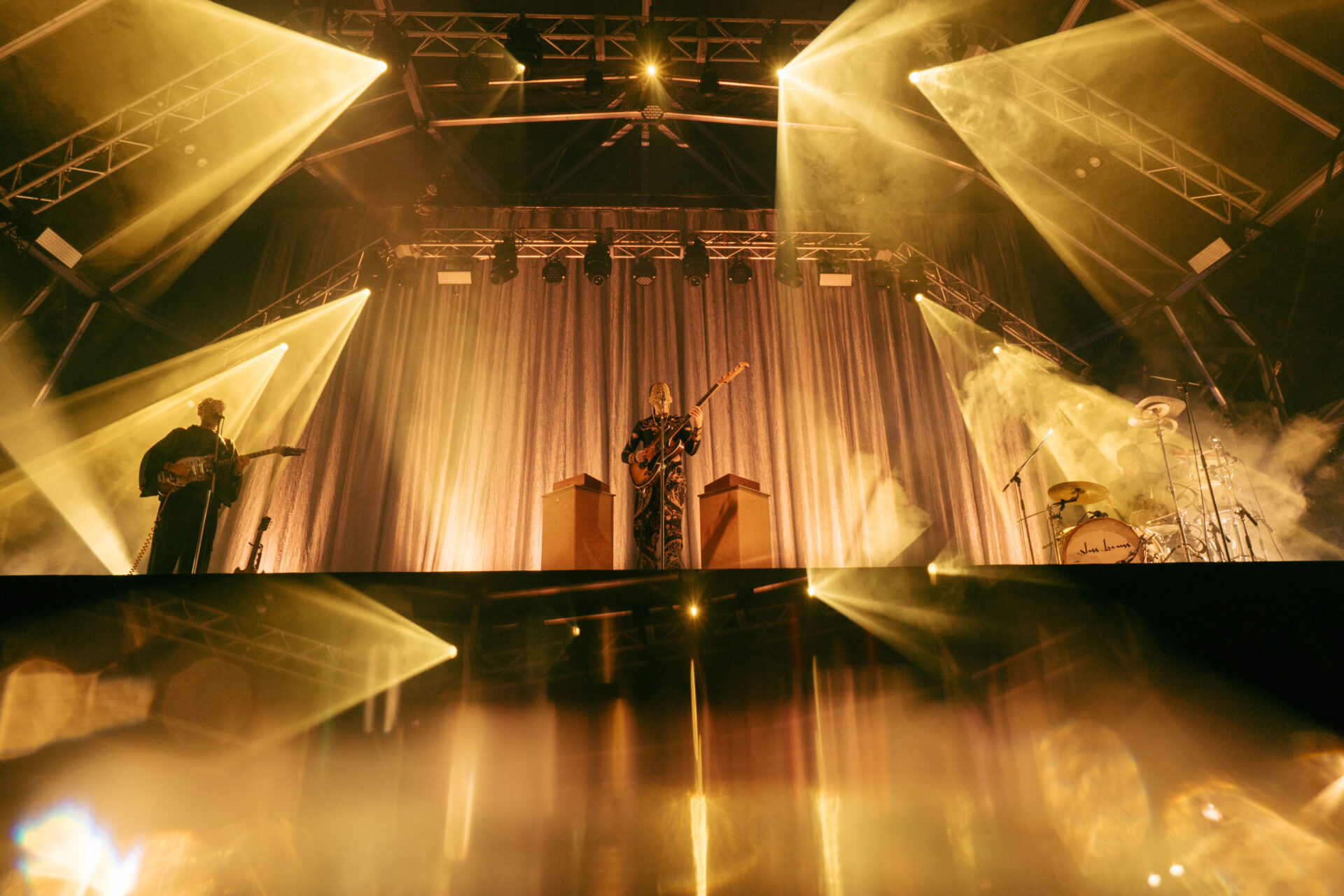 夕方、雨が本格的に降り始めたタイミングで、ビーズのマスクをつけた三人が静かにステージに立った。最初の一曲は「Mahal」。硬質なベースのフレーズの上に、中近東やインドを思わせるギターがゆっくり揺れて、グルーヴが少しずつ大きくなっていく。中盤以降はベースがシンセやエフェクトも操りながら音の層を増やしていき、電子音のうねりと淡々としたドラムに合わせて、前方から順番に体が縦に動き出す感じがあった。雨で冷えた空気の中でも、反復するリズムに身を預けると自然と踊れる、朝霧のフィールドに合ったセットだった。