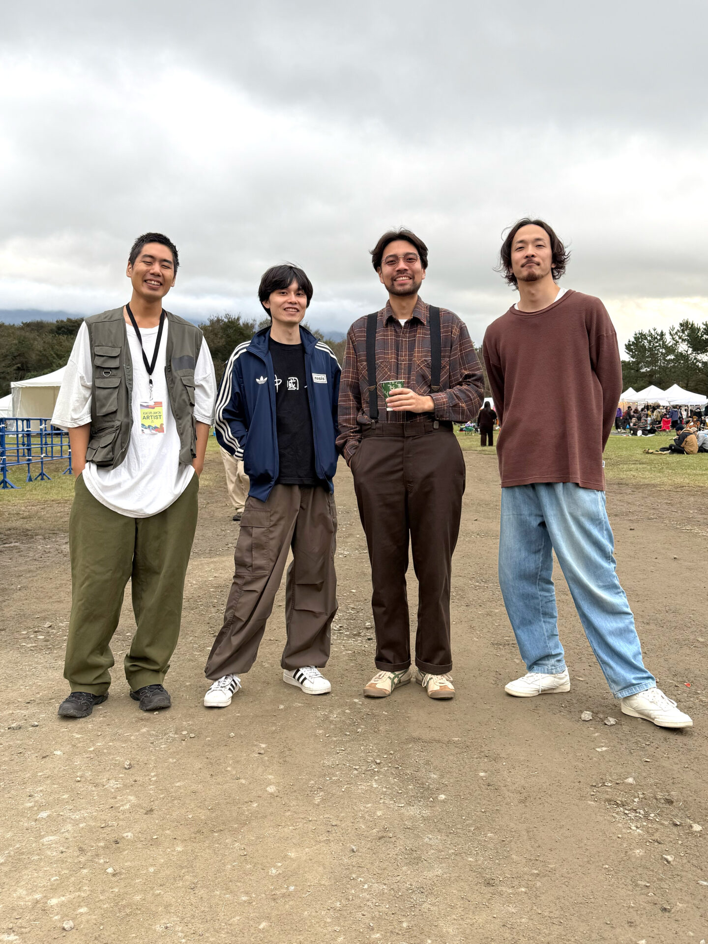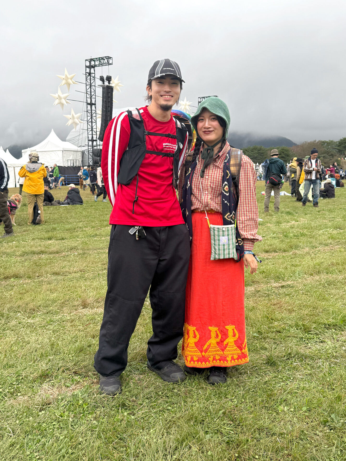 龍弥さんは、赤Tを主役にしたアウトドア寄りのレイヤード。キャップとハーネスベストでアクティブ感をしっかり出しつつ、黒パンツで全体をすっきり整えていたスタイル。柚衣香さんは、チェックのシャツに刺繍入りのロングスカートを合わせたフォークロアなムード。深緑のニットフードや小物の色づかいが絶妙で、朝霧の山景色と馴染む雰囲気。ふたり並ぶと “鮮やか+クラフト感”のコントラストがくっきり出る、会場でもよく映えていた組み合わせ。