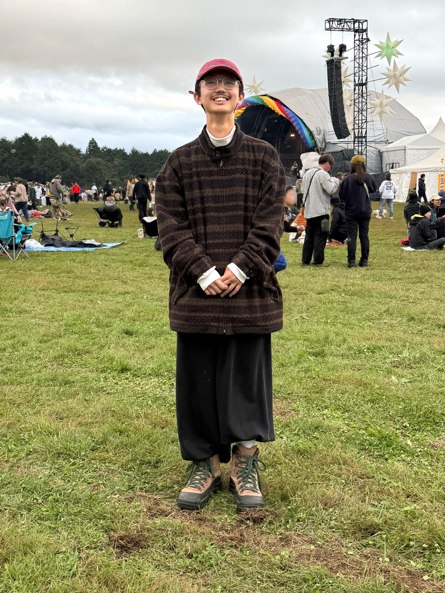 ブラウン系のパターンが入ったフリースを主役に、ワイドな黒パンツでゆるっとまとめた空気感が朝霧にフィット。足元はトレッキング寄りのブーツでしっかり固めていて、芝の湿りにも対応できる実用的な選択。赤いキャップがスタイル全体の重心を上げつつ、丸メガネの雰囲気と合わさって軽やかな印象に。ゆるさとアウトドアのバランスがきれいに出たスナップ。