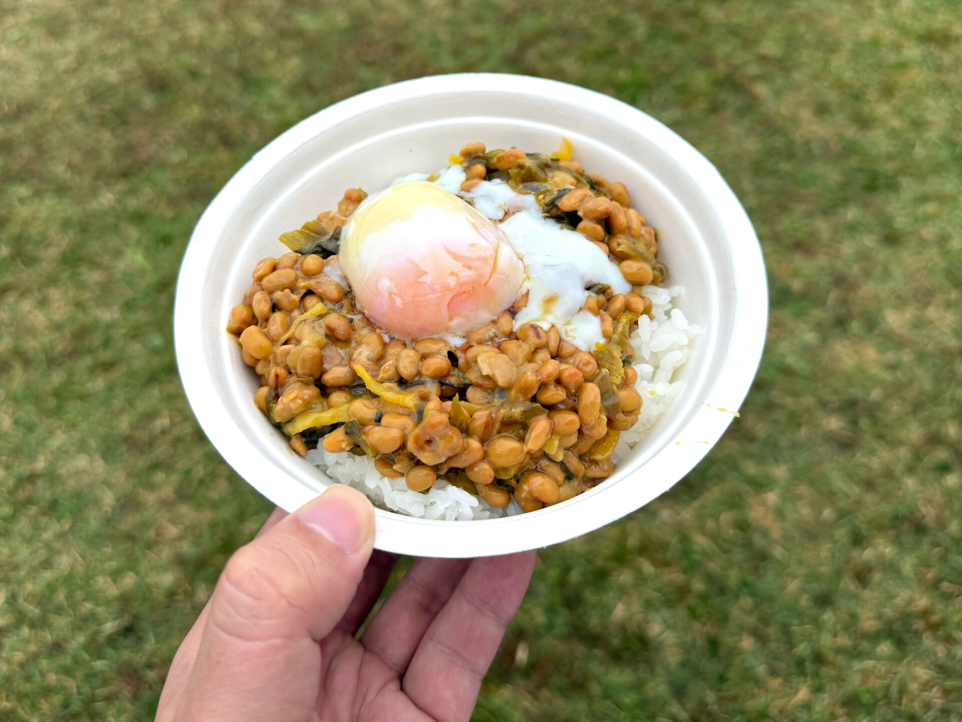 フジロックではおなじみの“きりざいめし”を、ここ朝霧でも発見。細かく刻んだ野沢菜と納豆を合わせたあの味に、温玉を落としたシンプルな一杯。混ぜるほどに香りと旨みが立ち上がって、疲れた胃にもすっと入るやさしさがある。重さがないので、ライブの合間にさらっと食べられるのも嬉しいポイント。朝霧の冷えた空気の中で食べると、より一層ほっとする定番メニュー。