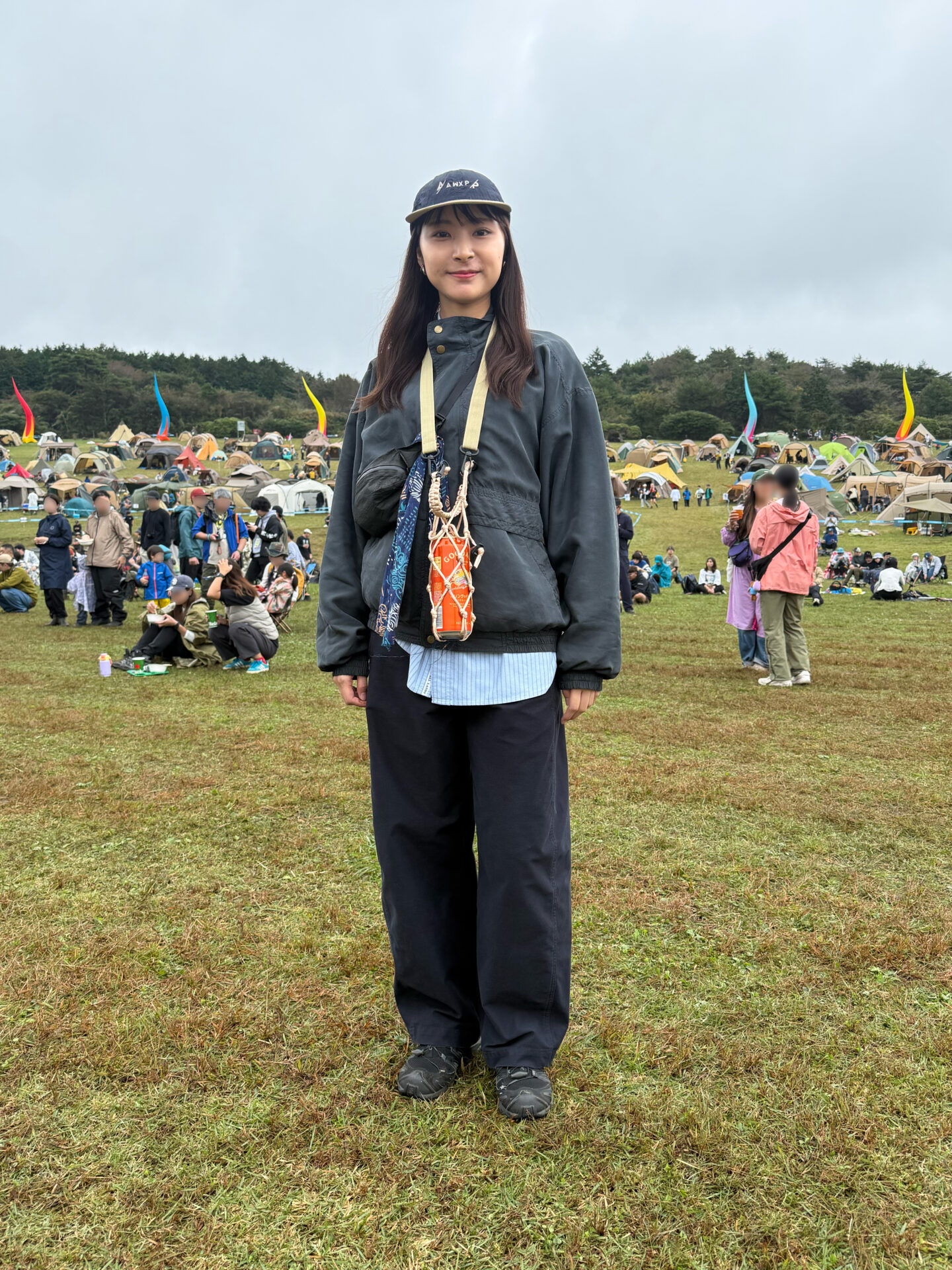 深いネイビーのナイロンアウターにワイドパンツを合わせて、朝霧の湿気と冷気にちょうどいいアウトドアバランス。ストラップバッグを重ねた胸元がポイントになっていて、オレンジの編み込みが着こなしに動きをつくる。キャップで全体の重心を上げつつ、黒〜ネイビーの濃淡でまとめた落ち着いたフェススタイル。