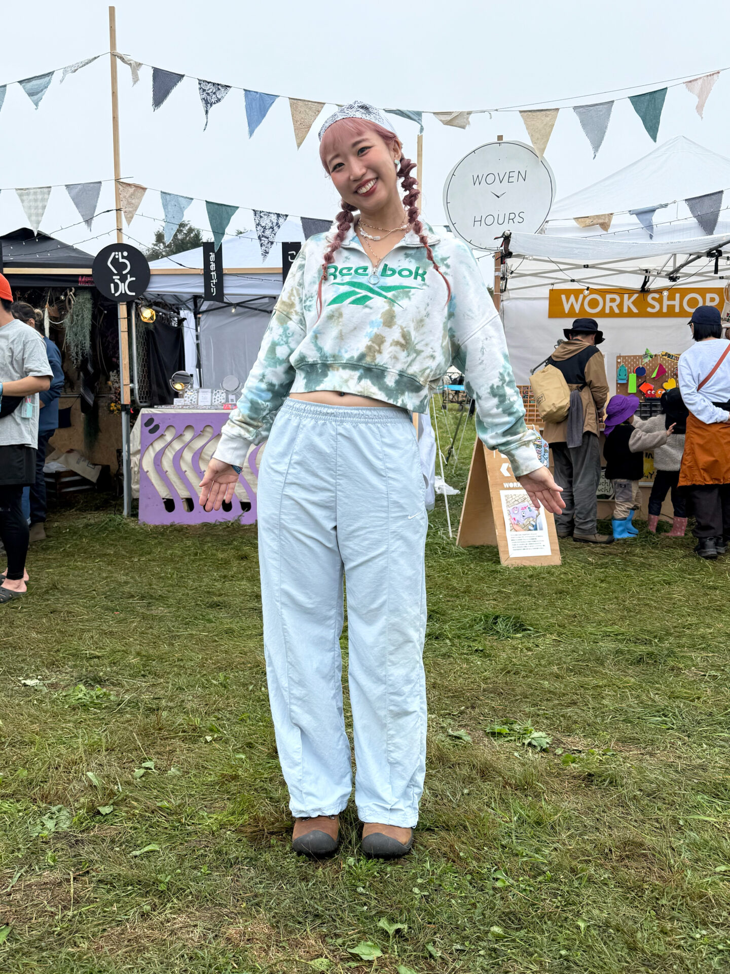 淡いブルーのパンツに、タイダイ調のリーボックのスウェットを合わせた軽やかなカラーリング。寒色のグラデーションが朝霧の曇り空とも相性よく、全体に透明感が出るスタイル。バンダナや三つ編みのアレンジで上半身に動きをつけつつ、ネックレスの重ねづけがアクセント。足元はダークトーンで落ち着かせて、甘さとアウトドアのバランスをしっかり取っていたスナップ。