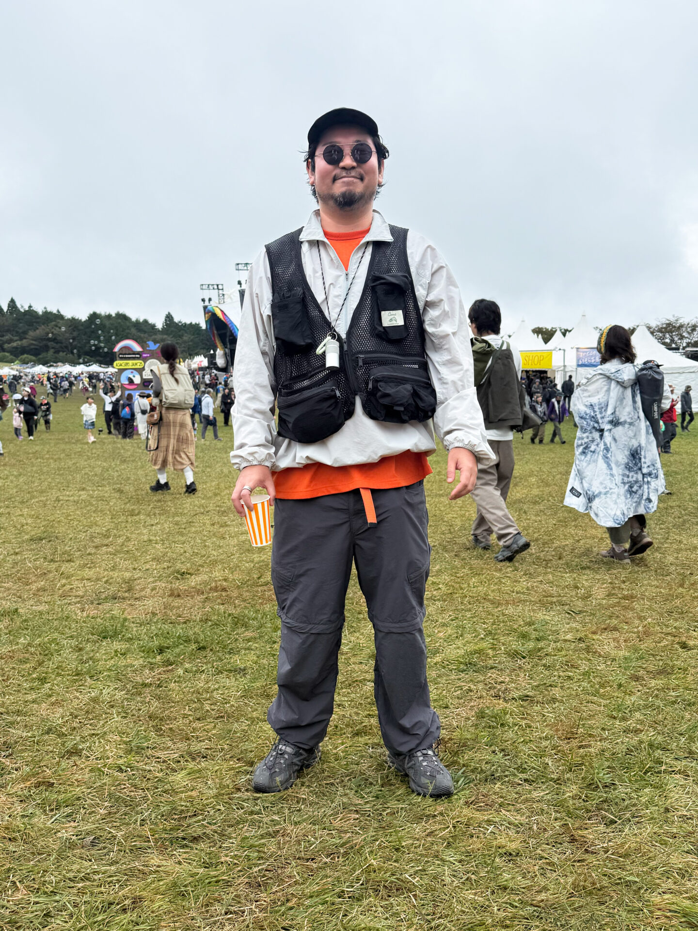白のウインドシェルにブラックのギアベストを重ねた、本気のフェス仕様。収納力と軽さを両立させつつ、インナーのオレンジが差し色としてしっかり効いている。テック寄りのグレーのパンツとトレッキングシューズで足元は安定感重視。キャップと丸サングラスの組み合わせも雰囲気がよく、全体のアウトドア感を引き上げていた。実用性と遊び心のバランスが取れた、朝霧らしいスタイル。