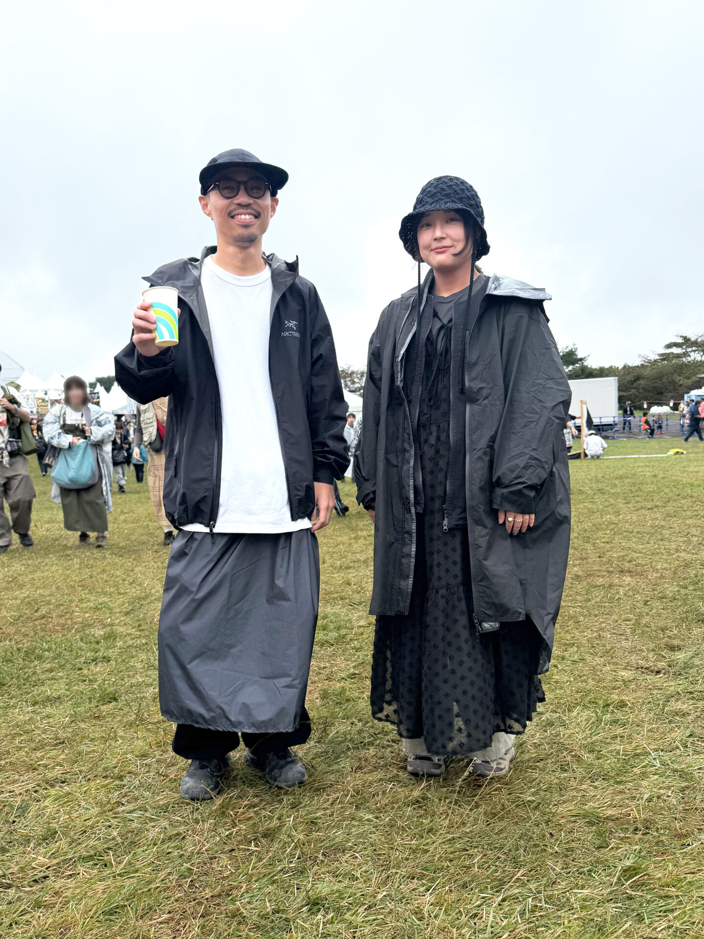 コースケさんは、白Tにアークテリクスのシェルを合わせたミニマルな組み合わせ。軽量シェルの質感とロング丈のレインスカートの相性がよく、天候が読めない朝霧で即戦力のレイヤード。黒のキャップとメガネで顔まわりを締めて、アウトドアに寄せつつクリーンに整えている。アズミさんは、黒のドットワンピースに同系色のロングシェルを重ねて奥行きを出したオールブラック。編み感のあるバケットハットがアクセントになり、重さが出ないバランスでまとまったスタイル。カラーを絞りつつ、素材とレイヤードでしっかり魅せるふたりのスナップ。