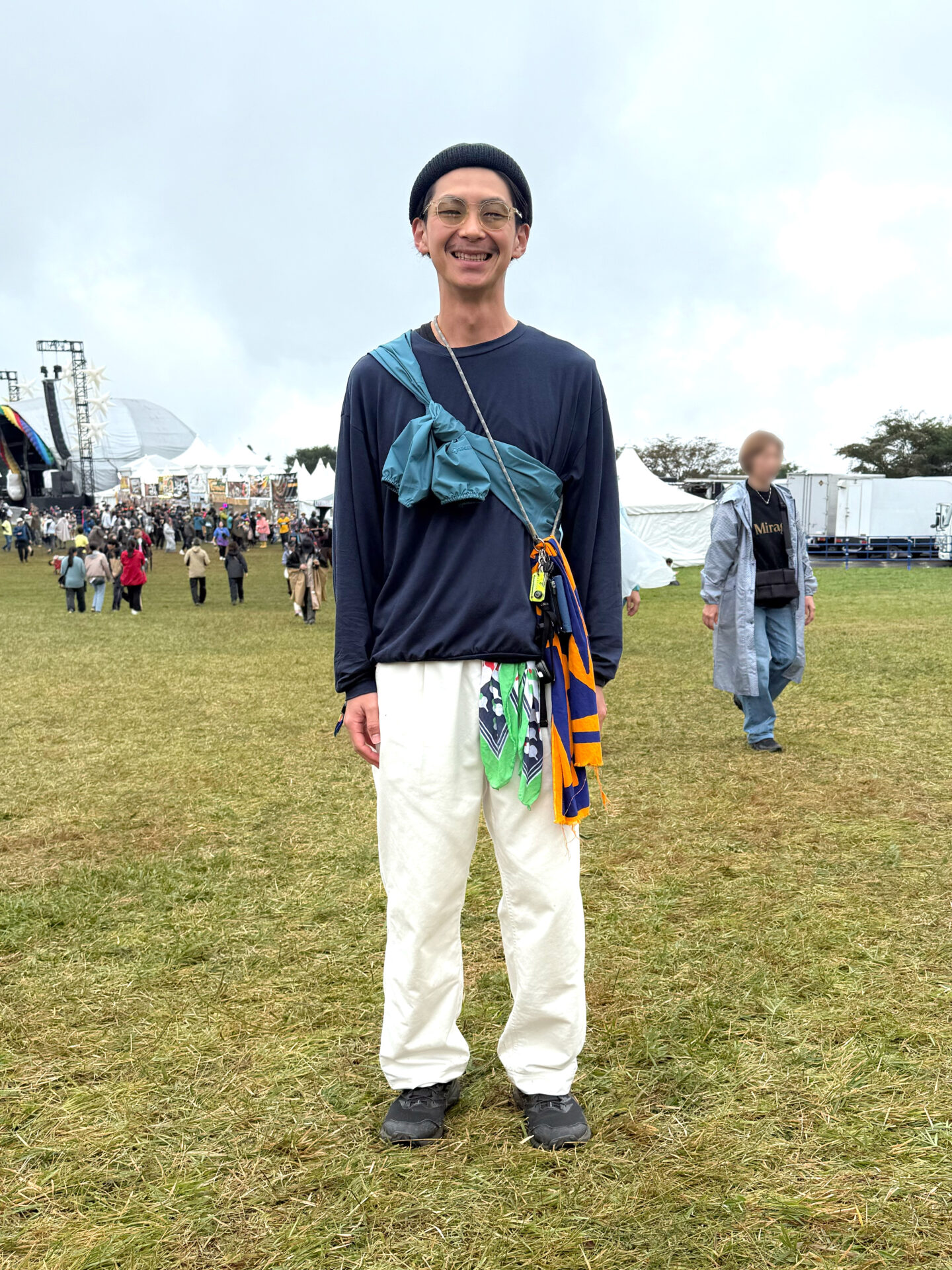 芝生のフィールドには、それぞれの時間を楽しむための服装や道具が自然と集まっていて、歩くだけで朝霧らしい空気が感じられた。風に合わせて羽織るものを変えたり、ステージの合間にストールを巻いたりと、実用性とその人らしさがしっかり表れている。ここでは、会場で出会った装いをそのままスナップとして紹介していく。