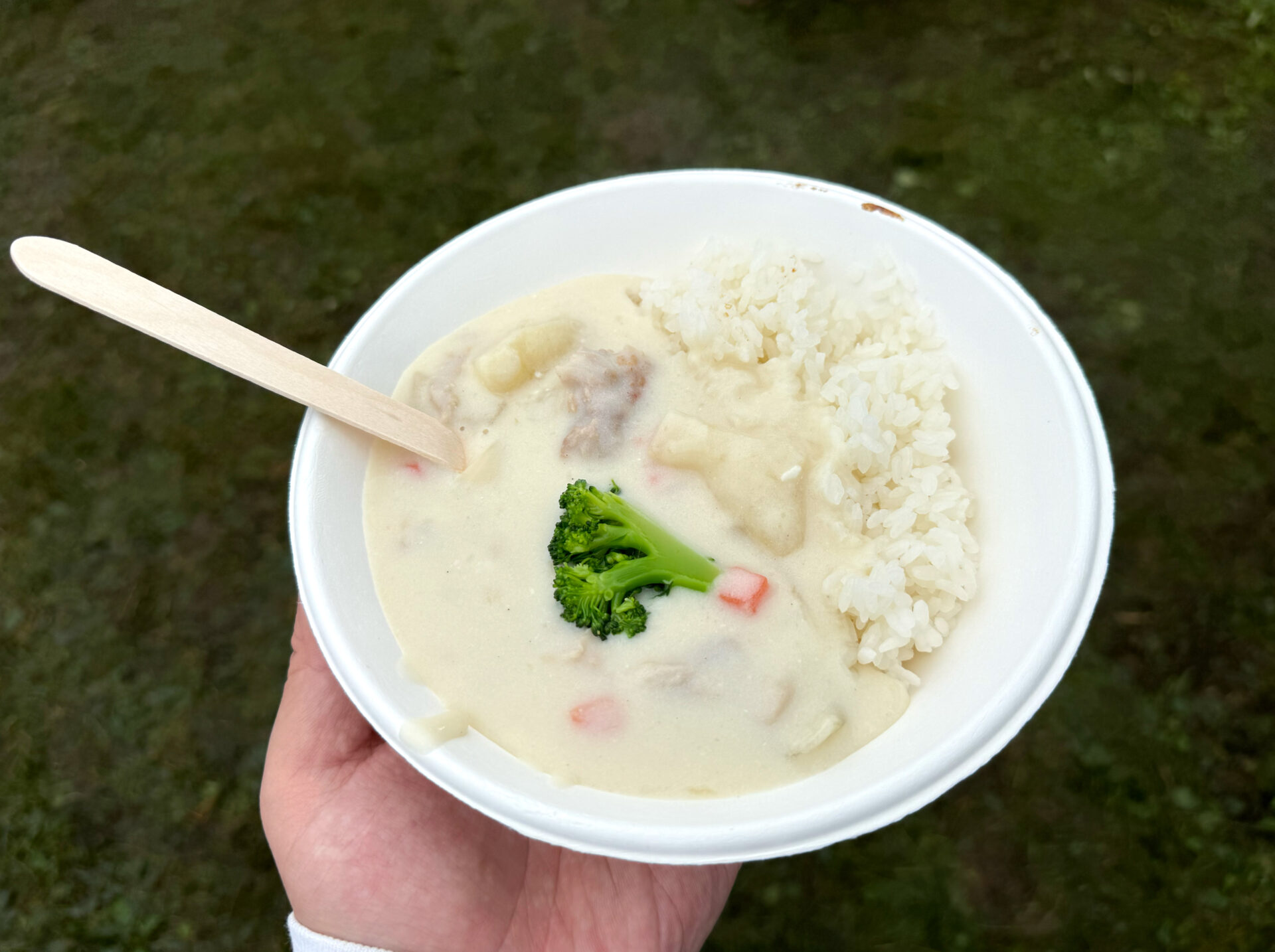 朝霧高原の牛乳でつくる、まろやかなクリームシチュー。コクはしっかりあるのに重さがなく、外で冷えた身体にすっと入ってくる味。ごろっとした野菜とほろっとした肉がスプーンにちょうどよく、ライスとの相性も抜群。曇り空の時間帯に食べると、温度も含めてしっかり沁みる一杯だった。