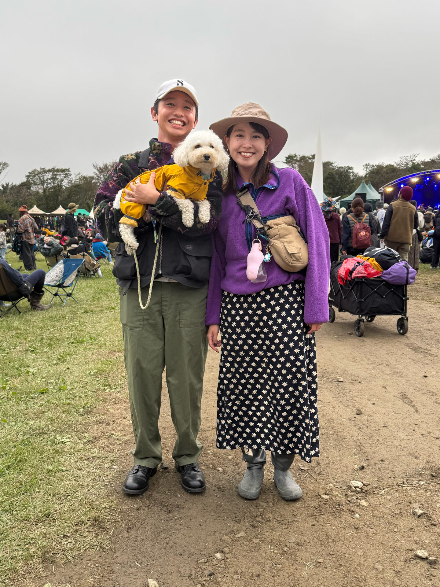 奎さんは、 モコッとした質感のフリース にブラックのベストを重ねて、防寒と収納力をしっかり確保したフェス仕様。落ち着いた色味の中で、ワンコの黄色いレインウェアがいいアクセントになっていて、視線を引き寄せる組み合わせ。真歩さんは、 パープルのフリースと花柄スカート のバランスがすごく柔らかい。ベージュのサコッシュとグレーのレインブーツでまとめて、朝霧の湿った芝にも対応した実用的なスタイル。全体的に“あたたかさ”と“フェスのリラックス感”がきれいに出ているカップルスナップ。
