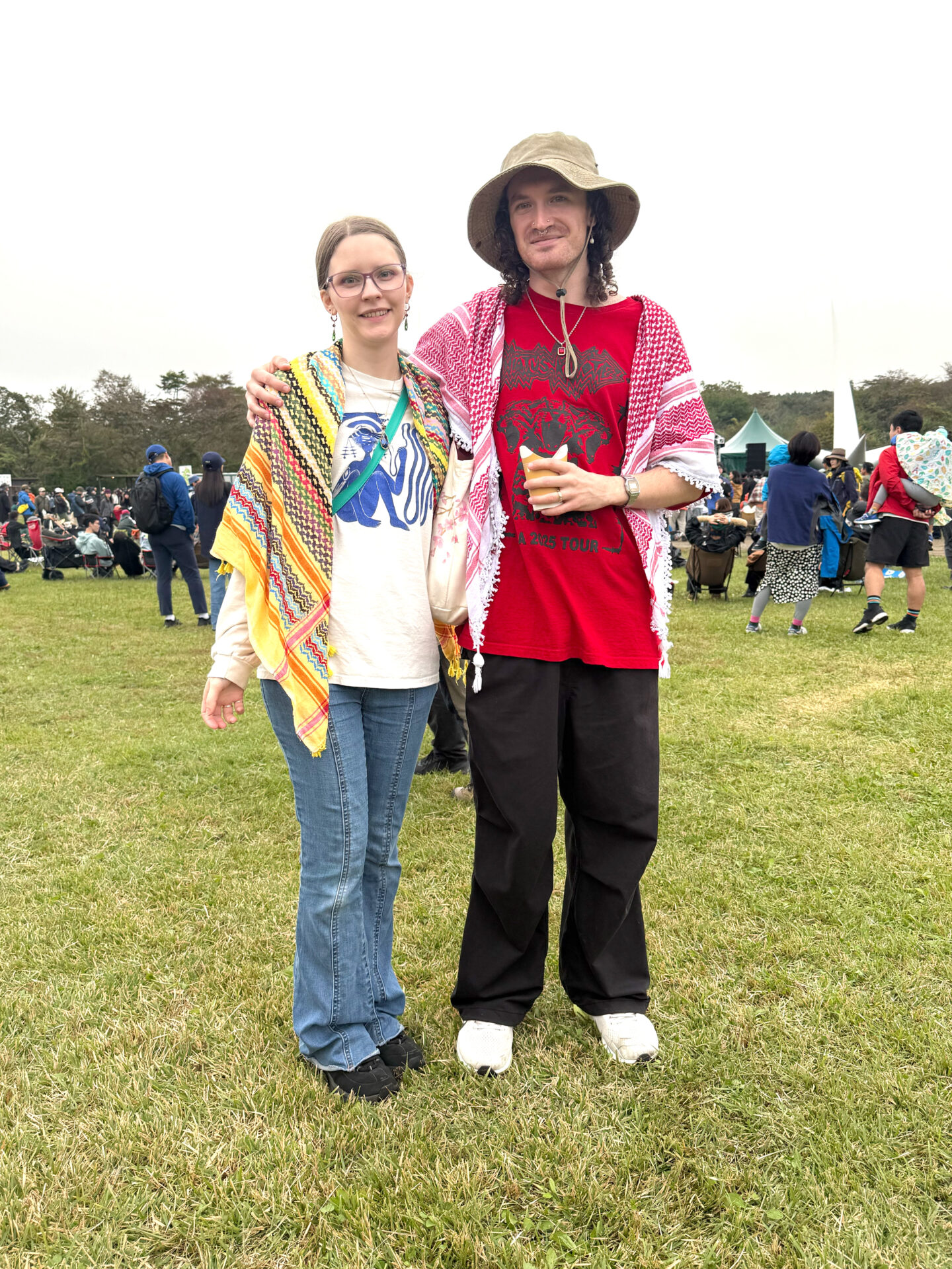 メロディさんは白Tとデニムのシンプルさに、多色ストールの揺れを重ねて柔らかいアクセントづけ。耳元のロングピアスまで一体でまとまっていて、朝霧の空気に合う爽やかなバランス。AlexさんはHIATUS KAIYOTEの赤いツアーTを主役に、ブラックパンツとベージュのハットで色の強弱を調整。肩にかけたストールの柄も効いて、リラックスしつつも存在感のあるスタイルに。ふたりの色使いと柄の合わせ方が、会場でも目を引くカップルコーデ。