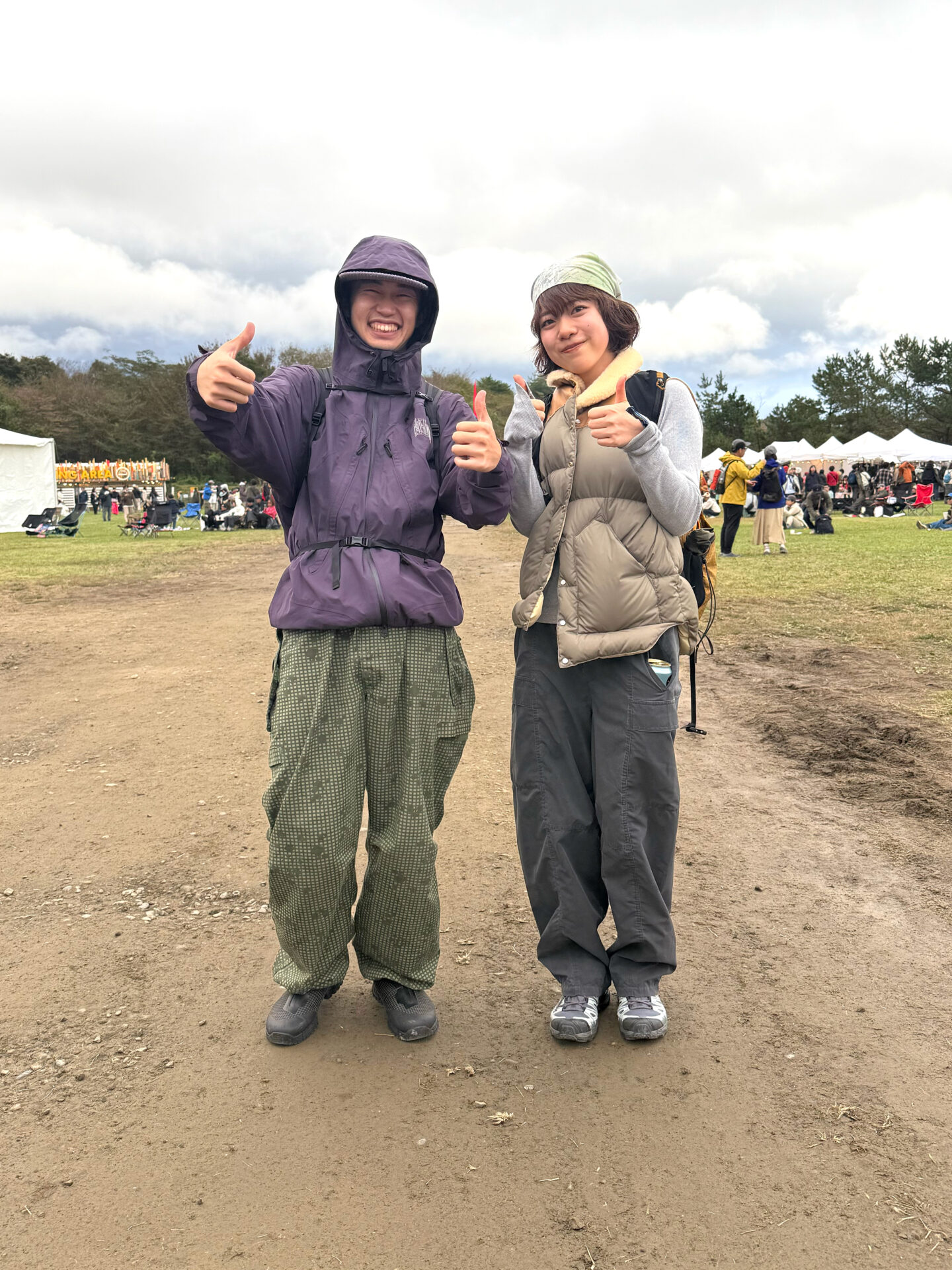 多聞さんは、パープルのシェルに柄入りのワイドパンツを合わせた、アウトドア寄りのレイヤード。フードをかぶったシルエットが可愛く、全体の色味も落ち着いていて朝霧の空気に馴染む組み合わせ。晴香さんは、グレーのロンTにベージュの中綿ベストを重ねて、ふくらみのあるバランスに。パンツはゆるめのカーゴで統一しつつ、グリーンのバンダナが差し色として効いている。ふたりの実用性をベースにしたゆるいアウトドアスタイルが、芝のフィールドでも自然体で目を引くスナップ。
