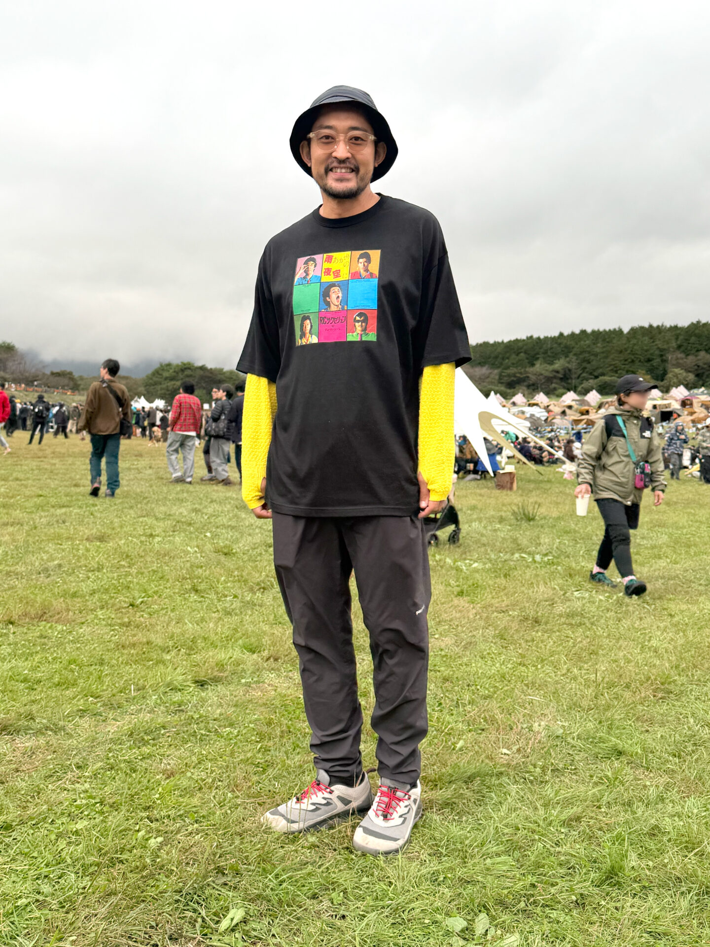 忌野清志郎のグラフィックTを主役に、インナーの鮮やかなイエローを差し込んだ軽快なレイヤード。黒のバケットハットと細縁メガネで顔まわりをまとめて、ポップさと大人っぽさのバランスがちょうどいい。パンツは動きやすいテック寄りの一本を選びつつ、足元はキーン×バルのコラボシューズで存在感をプラス。カラーコード入りのシューレースもポイントになっていて、フィールドで映える仕上がり。好きな音楽と機能性をしっかり共存させたスタイル。